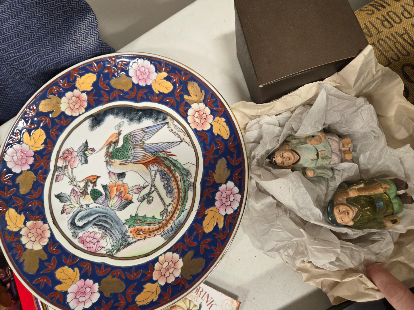 Beautiful decorative plate, features colourful phoenix birds and floral designs. Two small Asian-style figurines included. Perfect for collectors or home décor. Must pickup. Please. no etransfer or long holds. this is a cash price. bring cash. This is in storage and I will meet you there. I can access the building during 8 to 430 Monday to Friday. No one is there outside of those times.