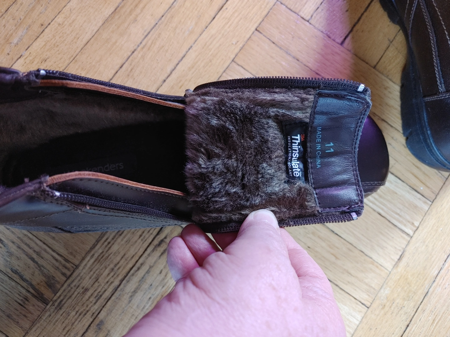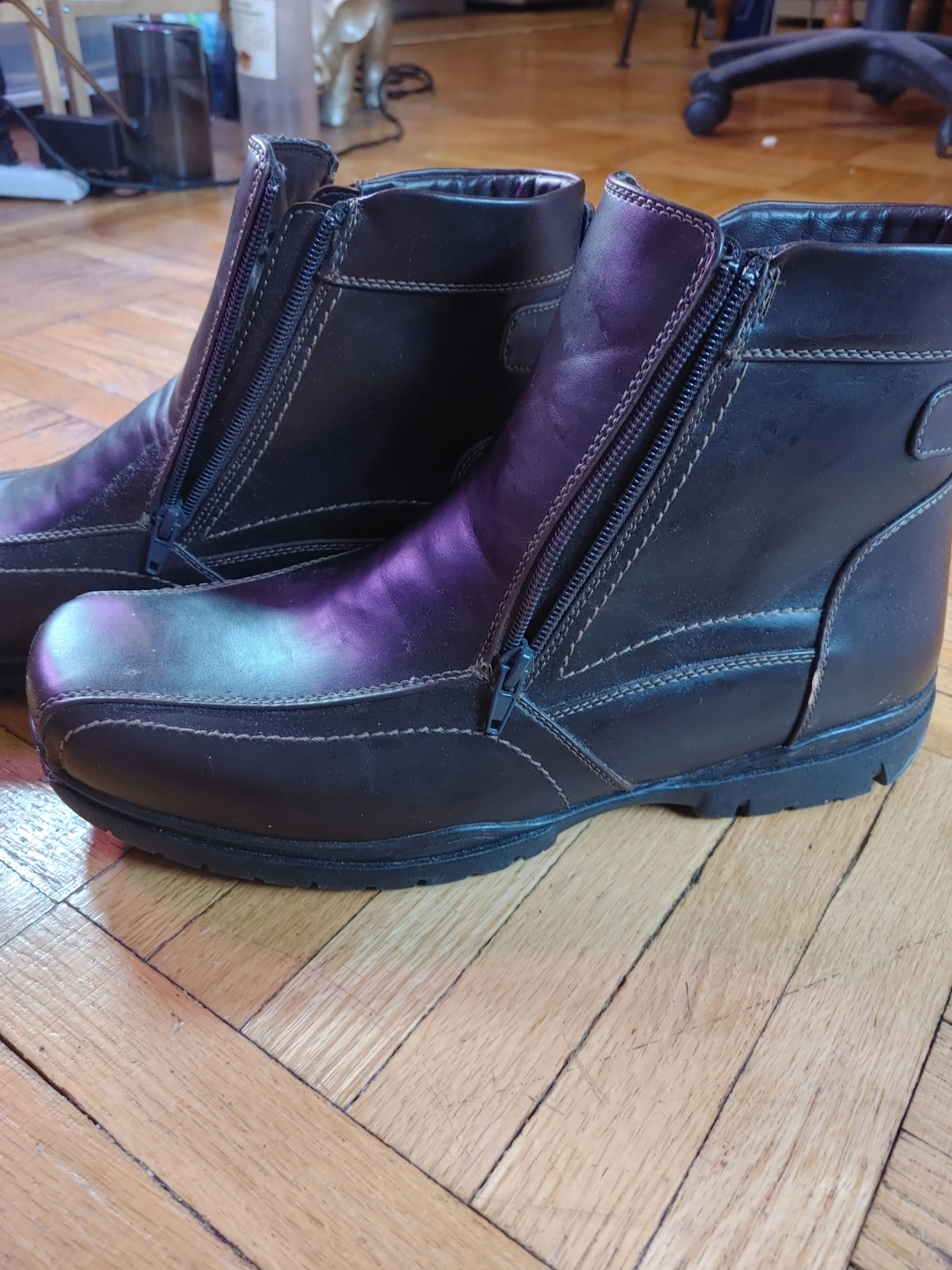 Brown leather ankle boots with side zippers. Thinsulate insulation. Durable rubber soles. Good for colder weather.