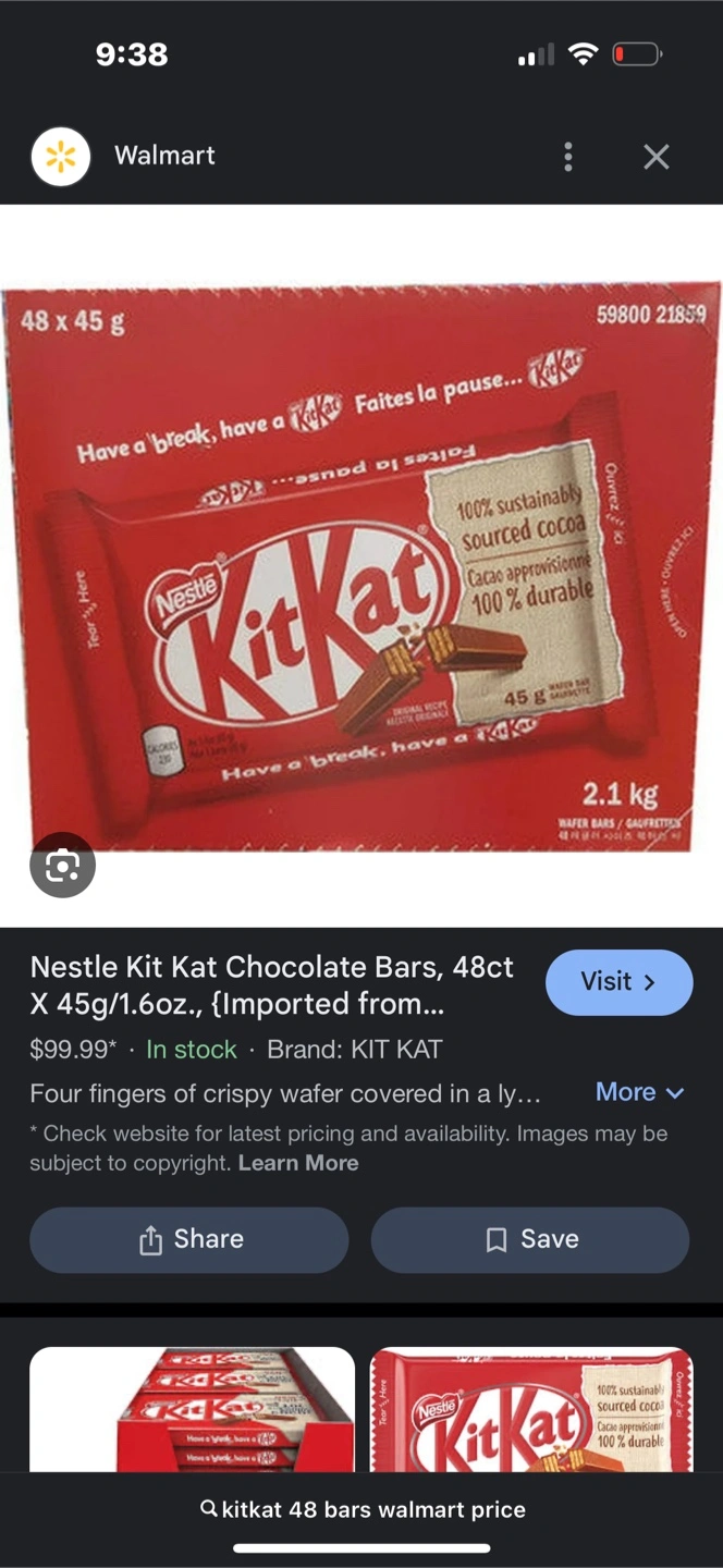 Bulk pack of 48 KitKat chocolate bars. Each bar is 45g. Crispy wafer fingers covered in chocolate.