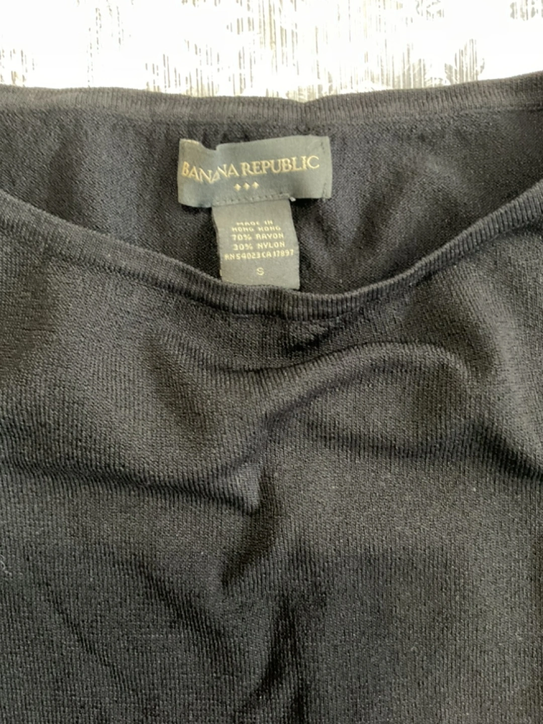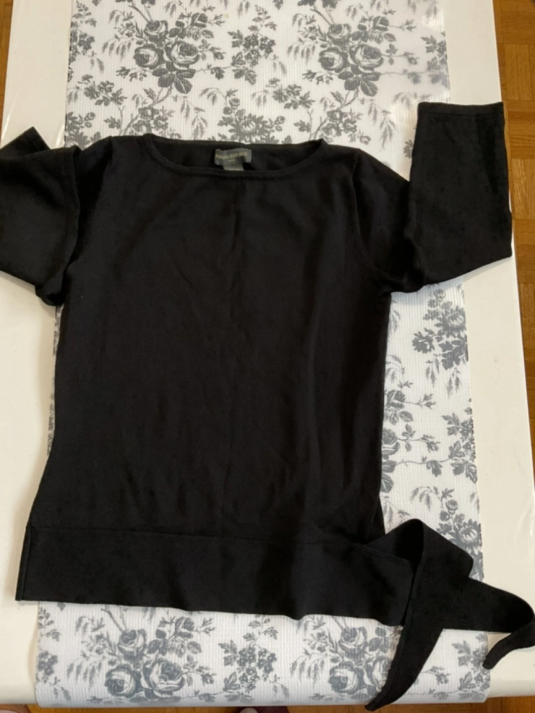 Black, 3/4 sleeve top. Size small. Fabric content: 70% Rayon, 30% Nylon. Features a tie waist.
