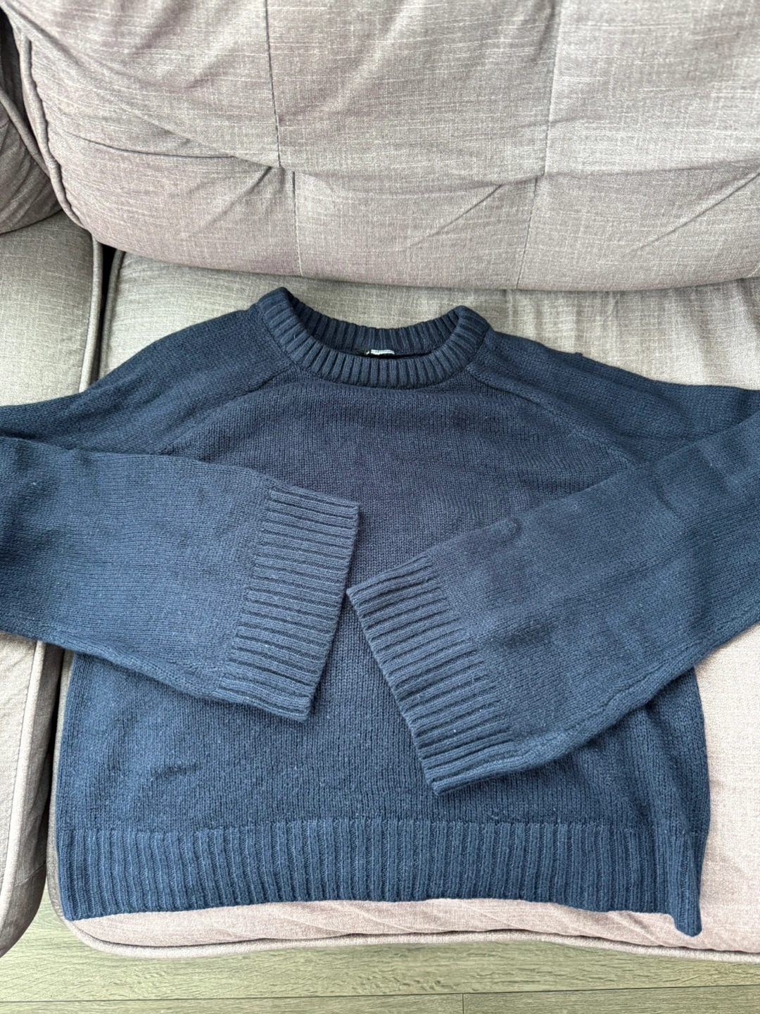 Dark navy blue crew neck sweater. Long sleeves with ribbed cuffs and hem. Soft knit material.