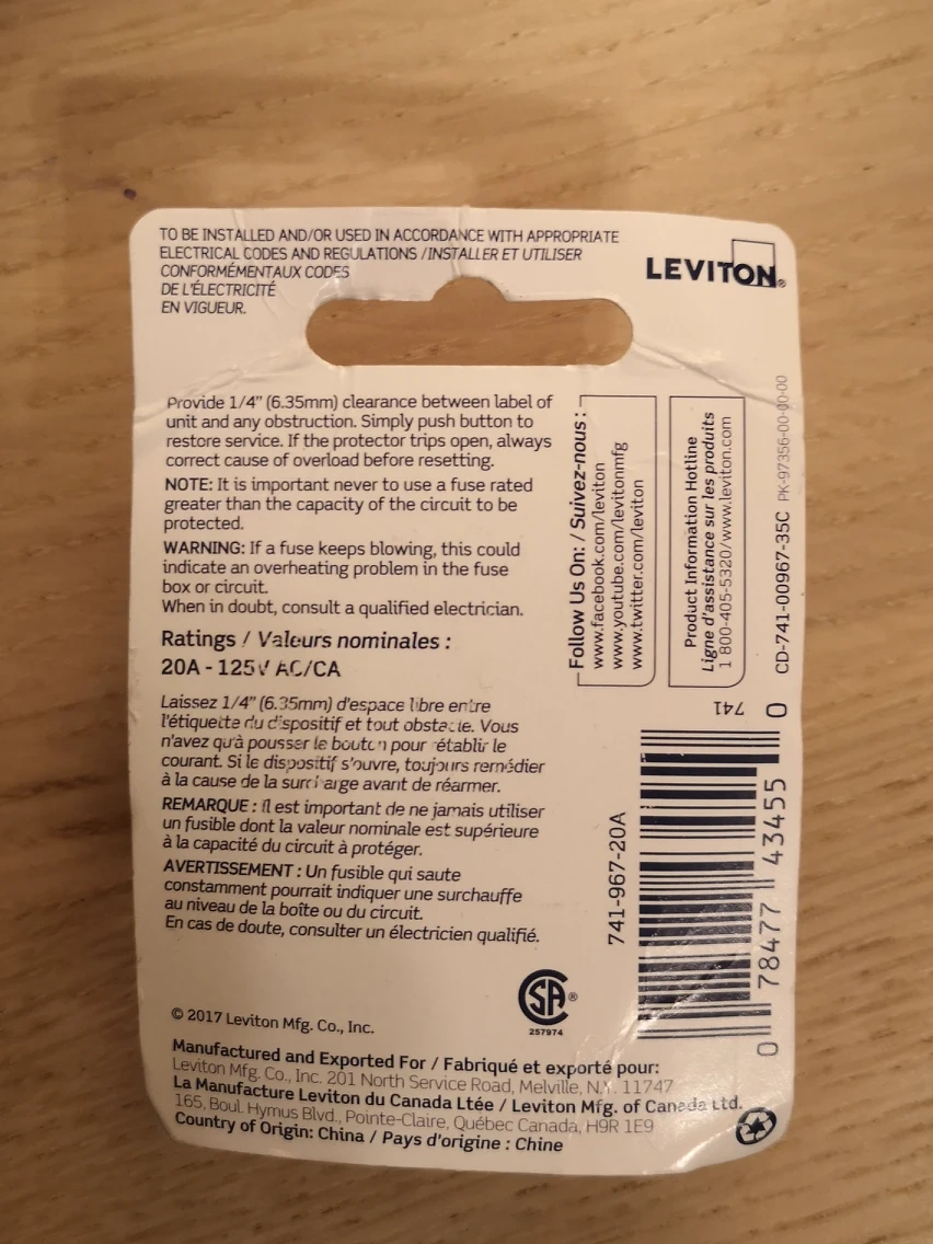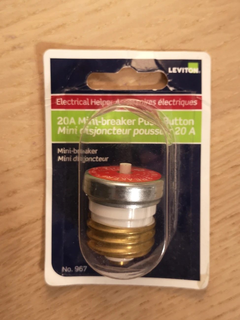 BNIP Leviton 20A Mini-Breaker Push Button Fuse Ratings: 20 A - 125 V AC Product No. 967