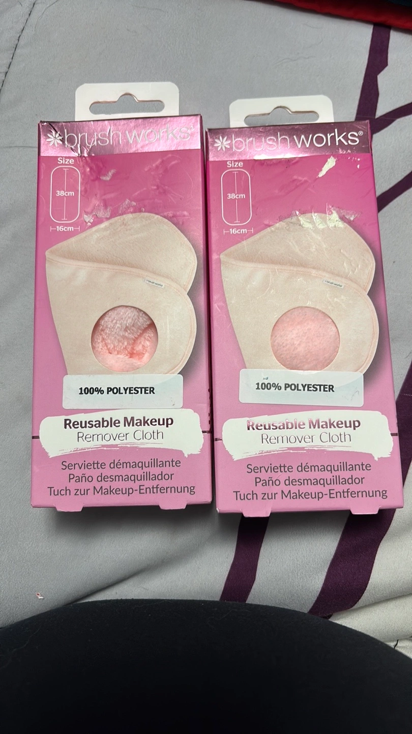 Two new Brushworks reusable makeup remover cloths. 100% polyester. Machine washable. Great alternative to single-use face wipes. 38cm x 16cm. price for both