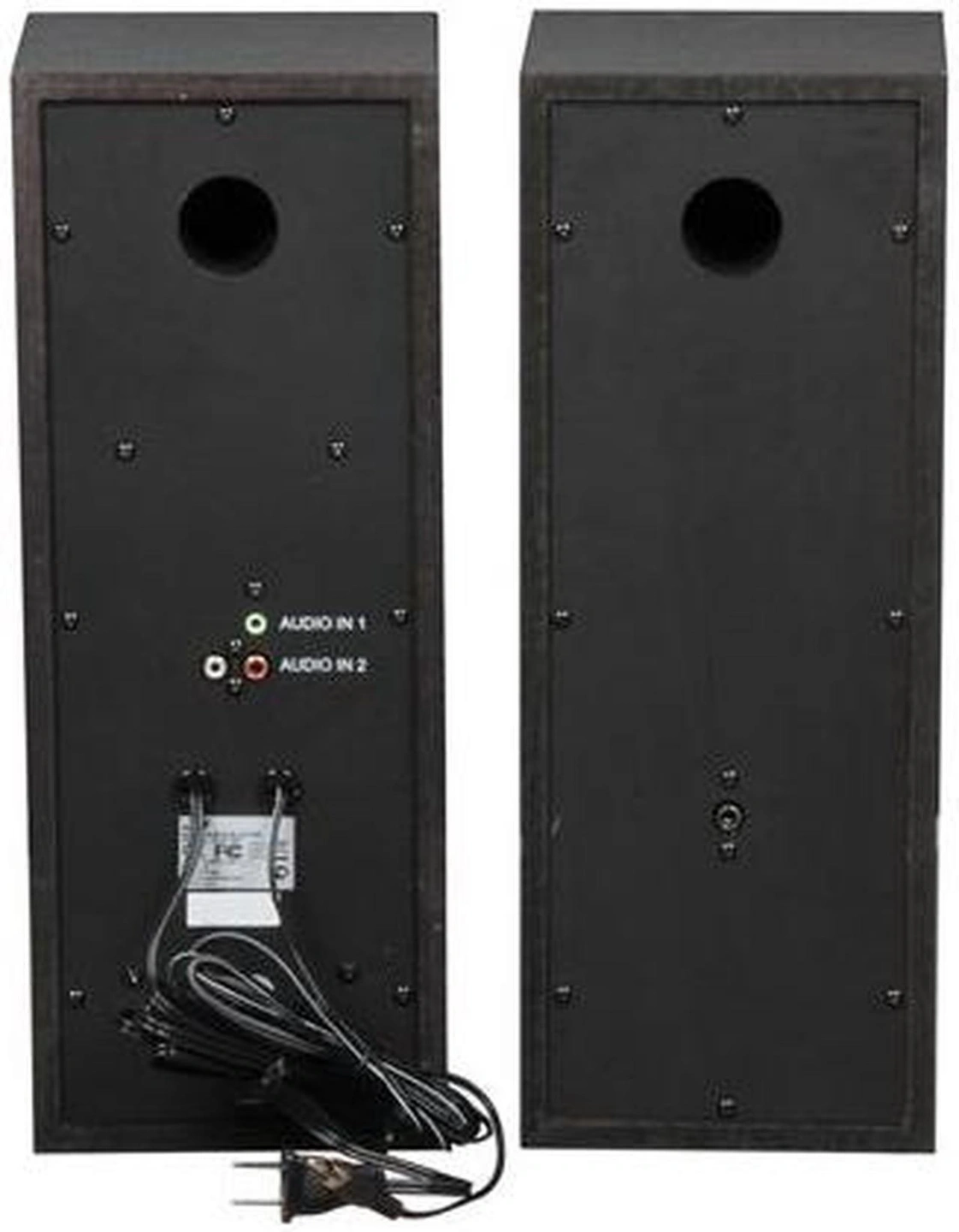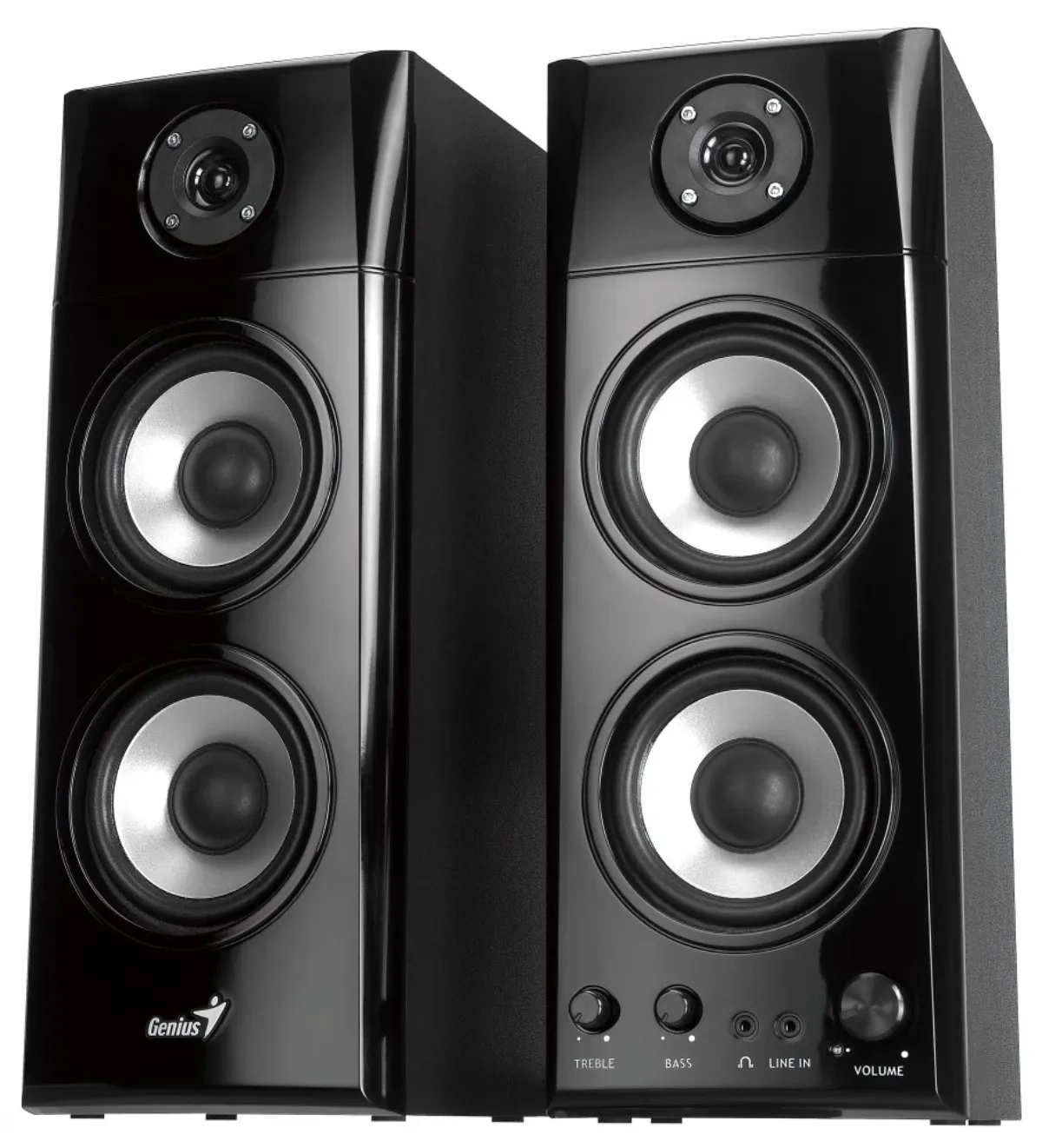 Pair of black Genius multimedia speakers. Three drivers per speaker. Volume and tone controls. Wired connection. Good sound quality.