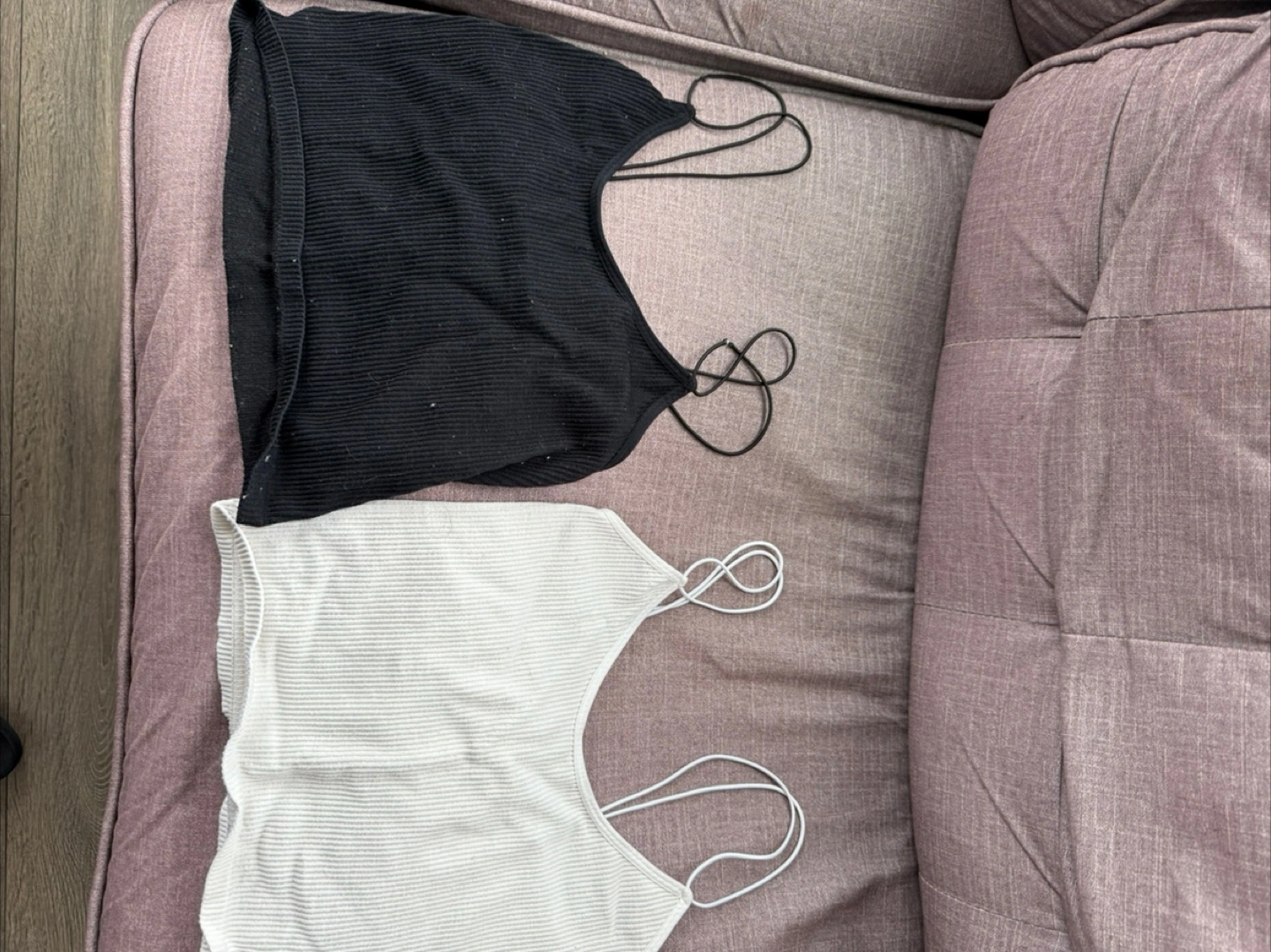 Pair of ribbed cami crop tops. One black, one off-white. Simple design, spaghetti straps. Good for layering or wearing alone. The black one straps are worn down but the white has no flaws
