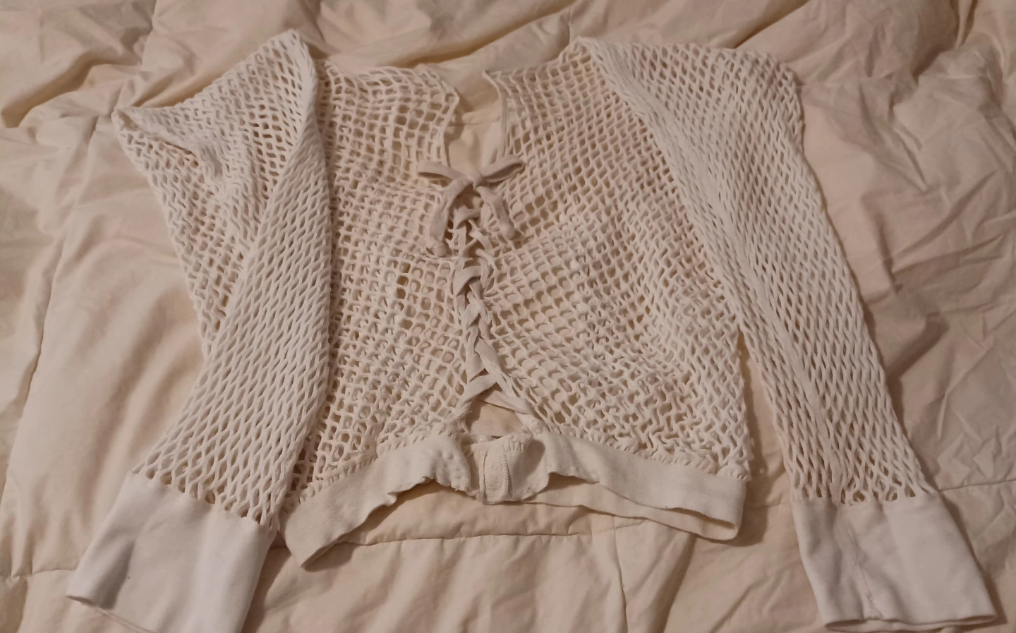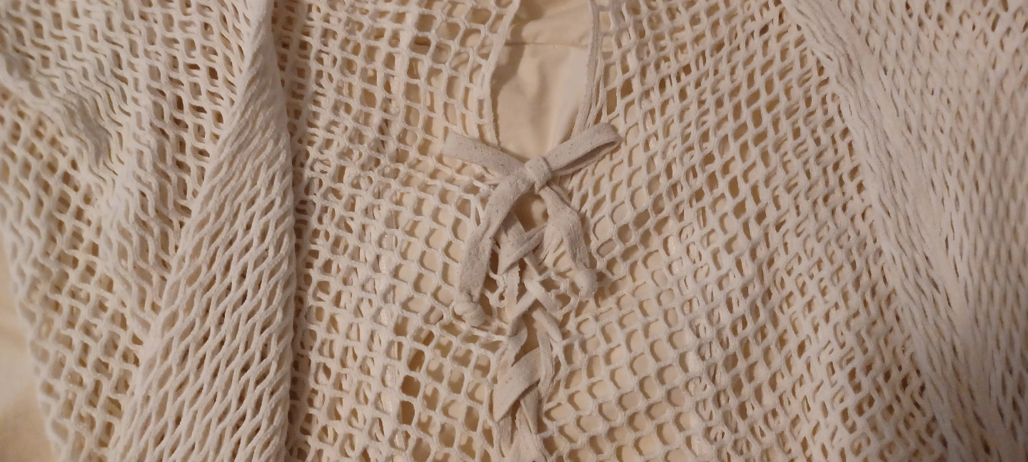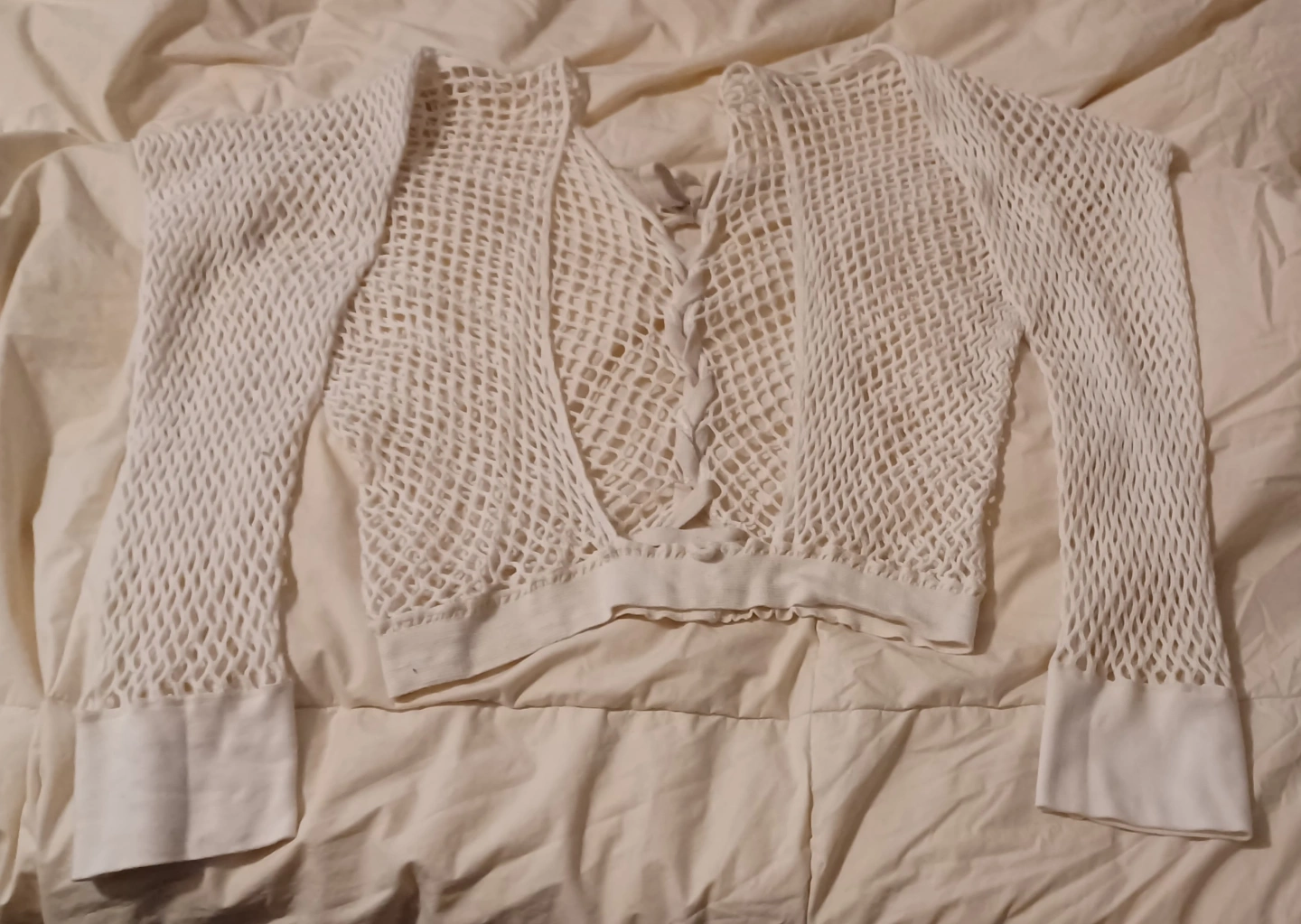 Unique cream-coloured fishnet crop top rad-cycled from vintage mens pants. Features long sleeves and a lace-up back detail. Casual, stylish, and perfect for layering. One of a kind!