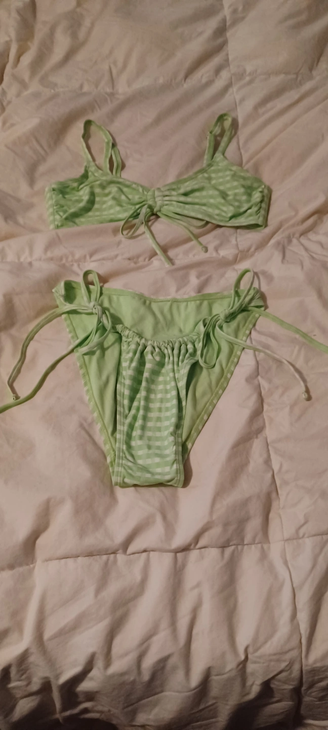Cute lime green and white striped bikini. Adjustable straps. Two-piece set. Perfect for summer. Only worn once. Small bust and adjustable bottoms.