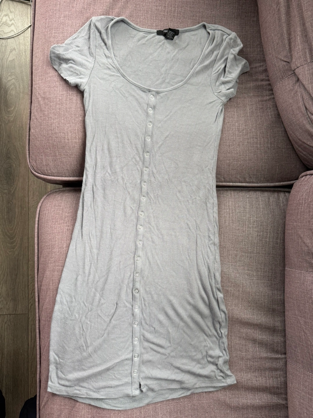Light grey mini dress. Ribbed fabric. Short sleeves. Button-down front. Size small.