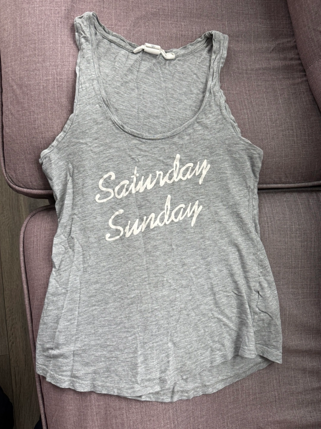 Lightweight grey tank top. Features a subtle "Saturday Sunday" graphic. Size small. Good pre-owned condition.
