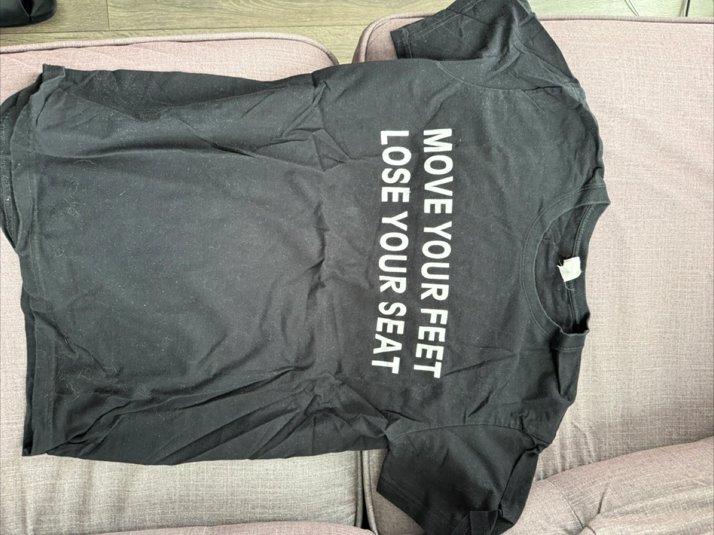 Black short sleeve t-shirt. Features a graphic print. Size small. Made in Cambodia.