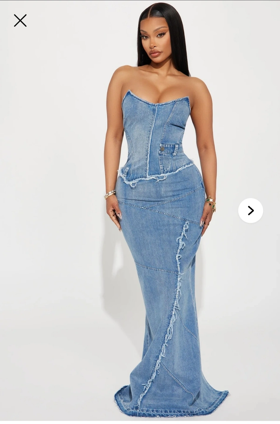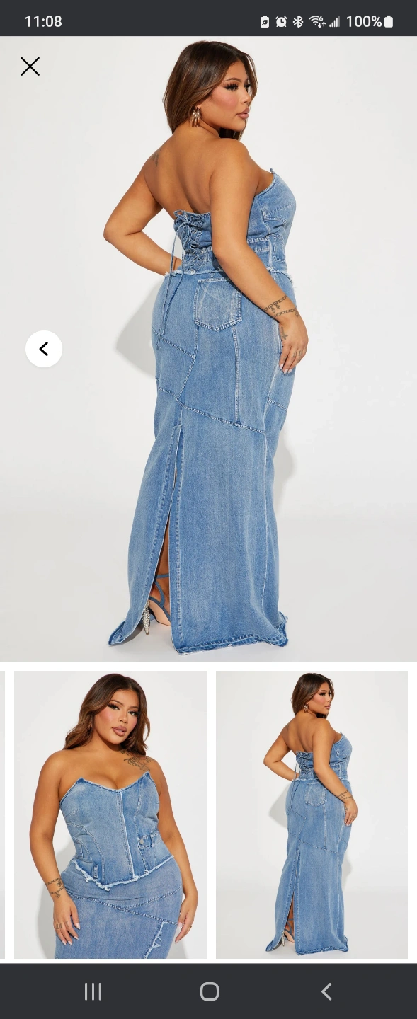 Medium Blue Wash. Denim Maxi Dress Strapless Sweetheart Neckline Pockets Seam Detail Frayed Edges Hidden Side Zipper Lace Up Back Back Center Slit 77% Cotton 15% Polyester 8% Viscose No stretch