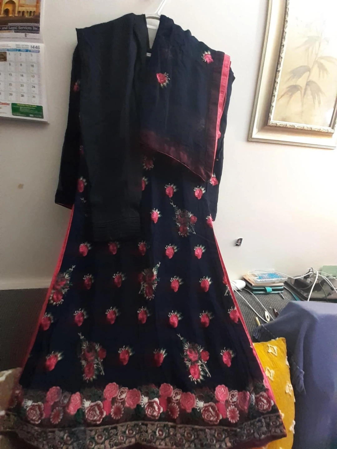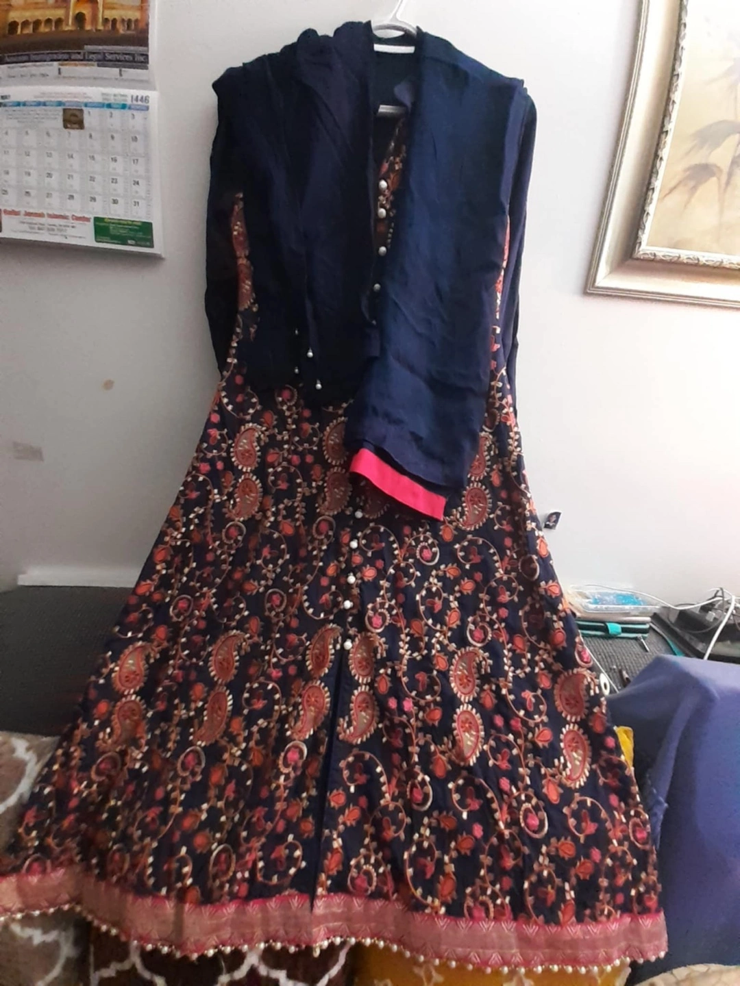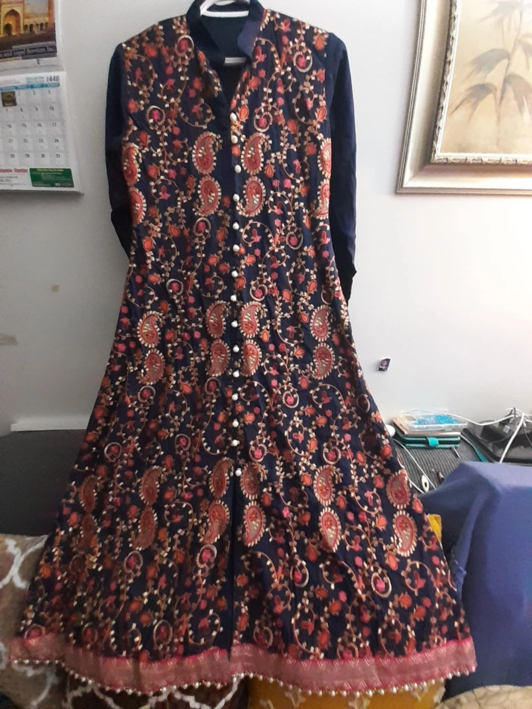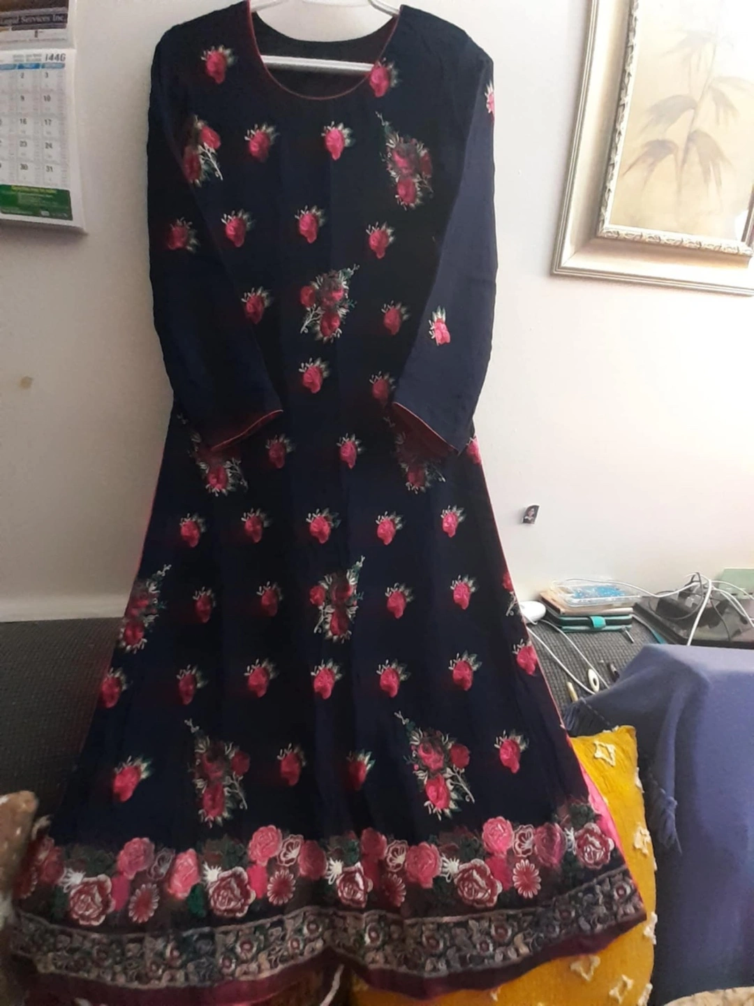 Gorgeous navy blue Anarkali suit. Features intricate embroidery, three-quarter sleeves, and a matching dupatta. Beautiful floral and paisley patterns. Perfect for special occasions. Very nice work chiffon material fully embroidery work used. 1/2 times kamez suit medium size $45 other one umbrella cuts never worn medium size $50 pick up Markham and Lawrence check my other listings please thanks’