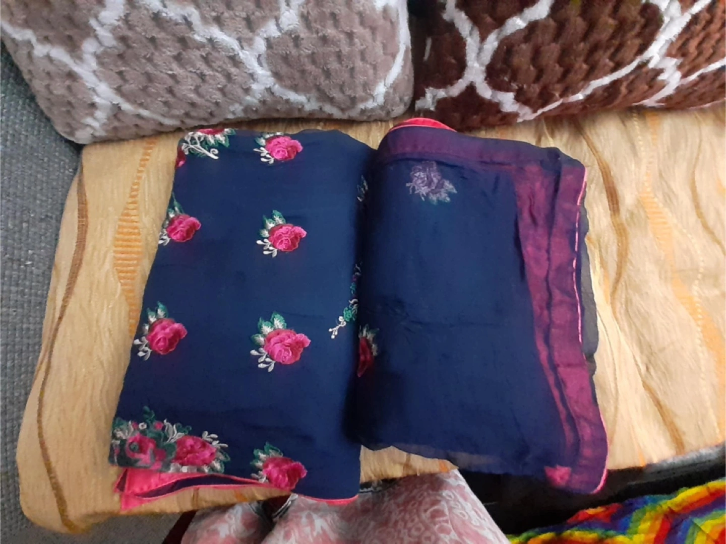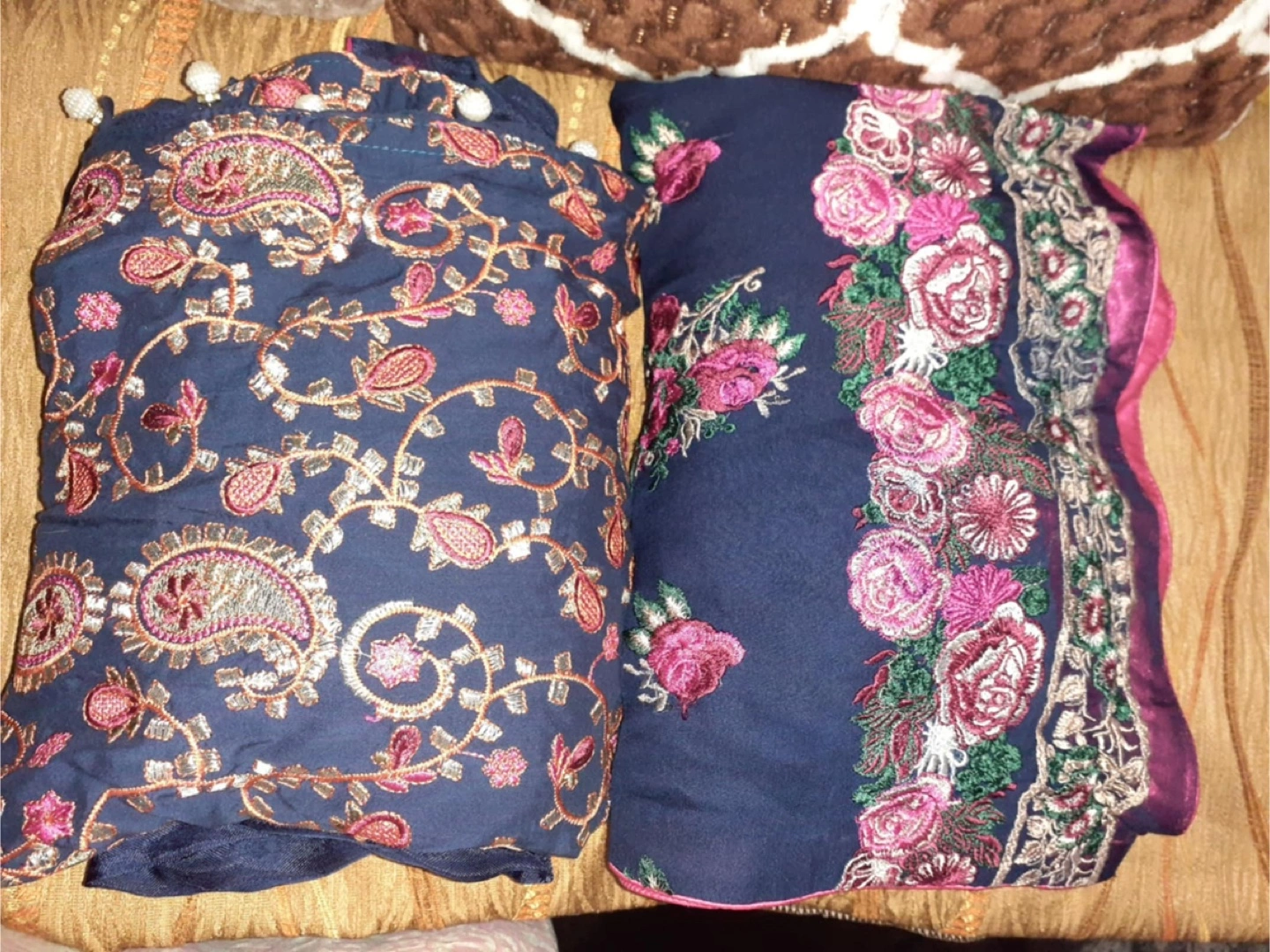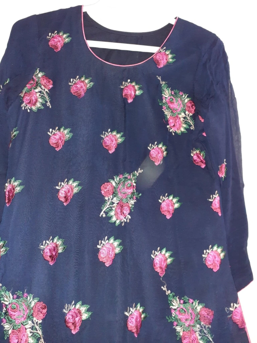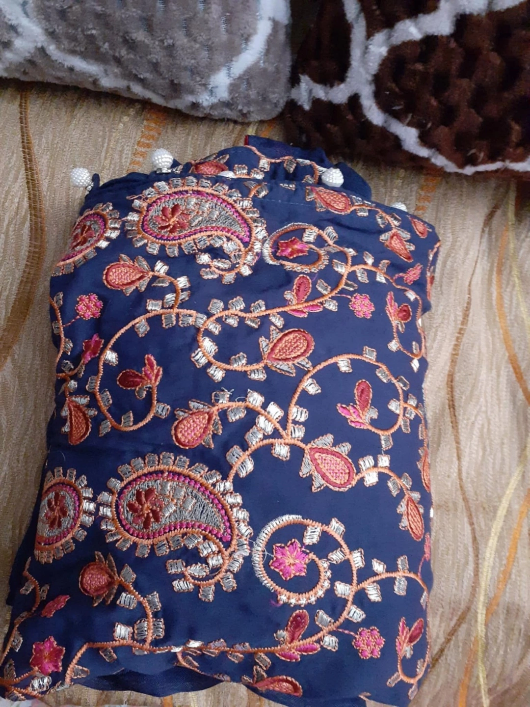 Gorgeous navy blue Anarkali suit. Features intricate embroidery, three-quarter sleeves, and a matching dupatta. Beautiful floral and paisley patterns. Perfect for special occasions. Very nice work chiffon material fully embroidery work used. 1/2 times kamez suit medium size $45 other one umbrella cuts never worn medium size $50 pick up Markham and Lawrence check my other listings please thanks’