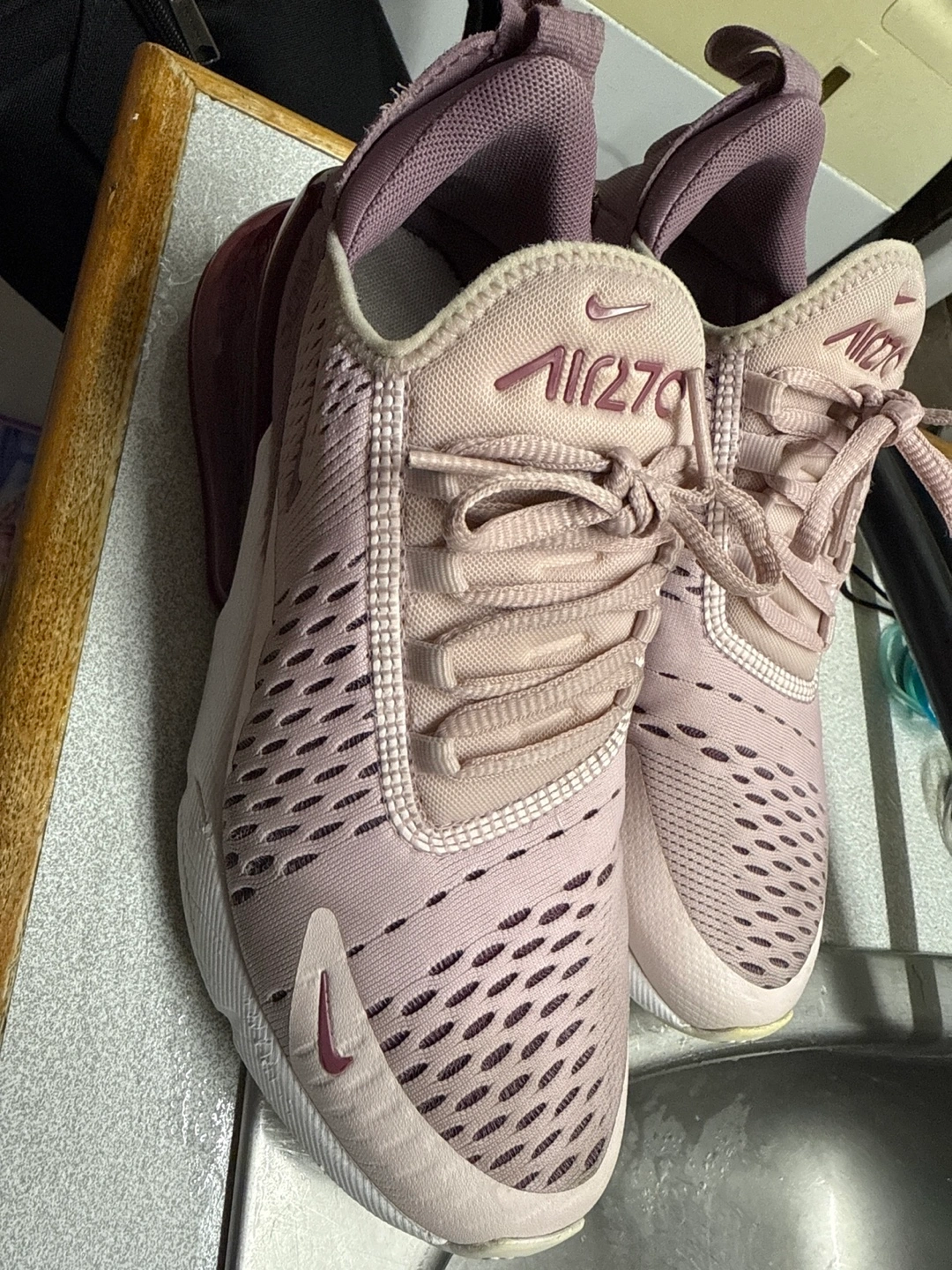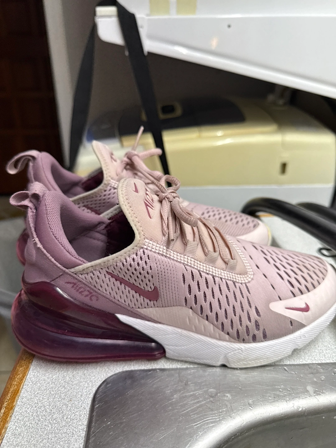 Pre-owned Nike Air Max 270 running shoes. Dusty rose colour with burgundy accents. Size 7 US women's. Good condition, minor wear. Freshly cleaned.