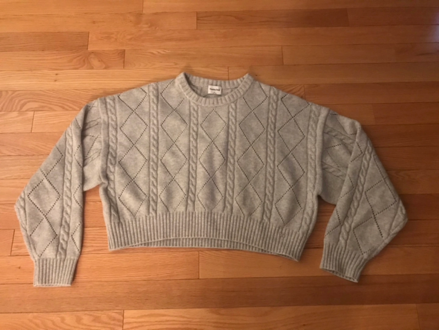 Light grey cropped sweater. Cable knit design with diamond pattern. Long sleeves. From Aritzia. Oversized fit. 23” pit to pit.