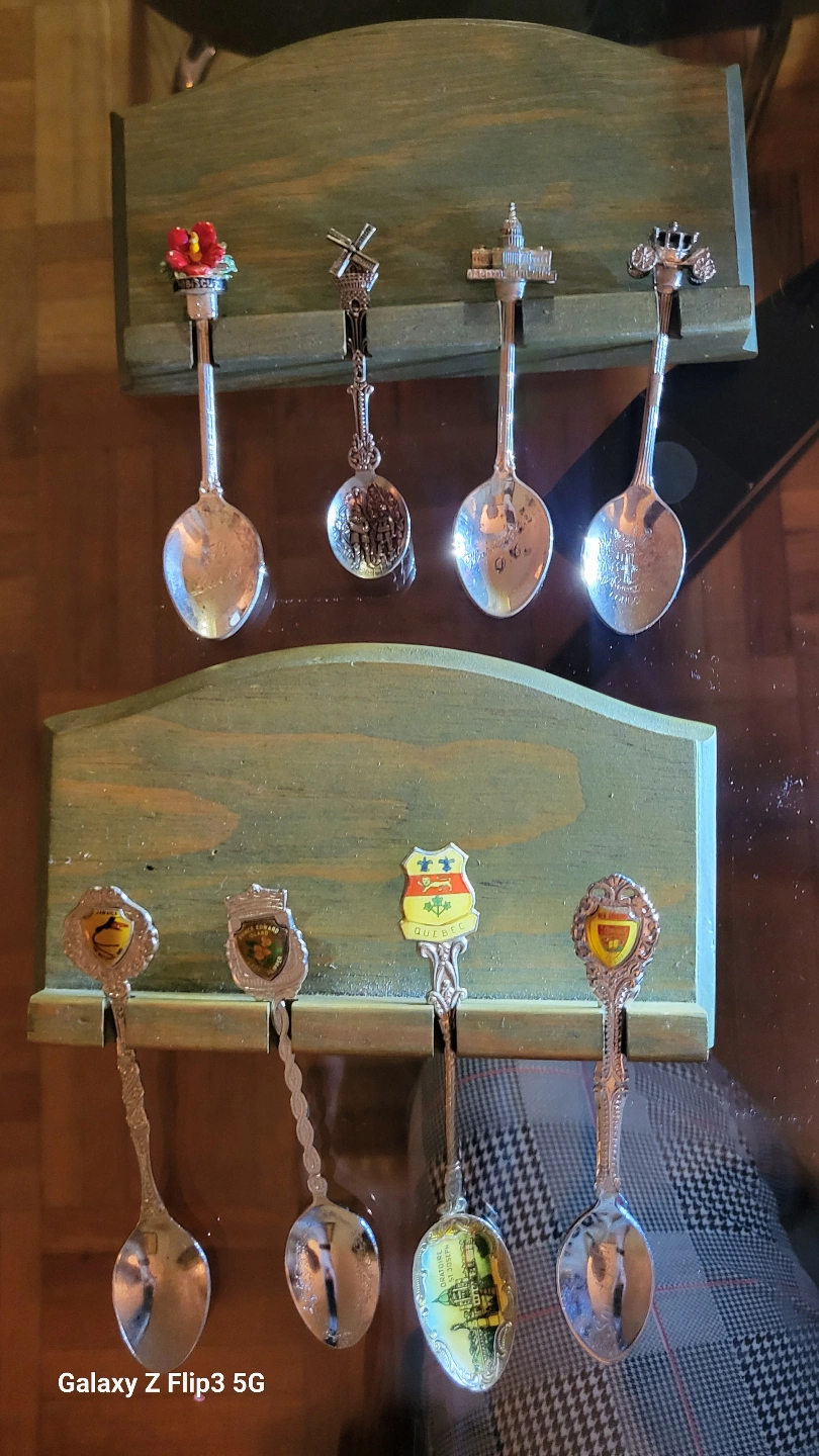 Set of collectible souvenir spoons. Features various locations, including Saint Johns, Quebec, PEI, Jamaica, Great Britain, Holland, St. Lucia and Washington. Comes with a wooden display racks. Perfect for collectors or travel enthusiasts. PLEASE DOUBLE TAP PICTURES TO ENLARGE THEM FOR FULL VIEW.