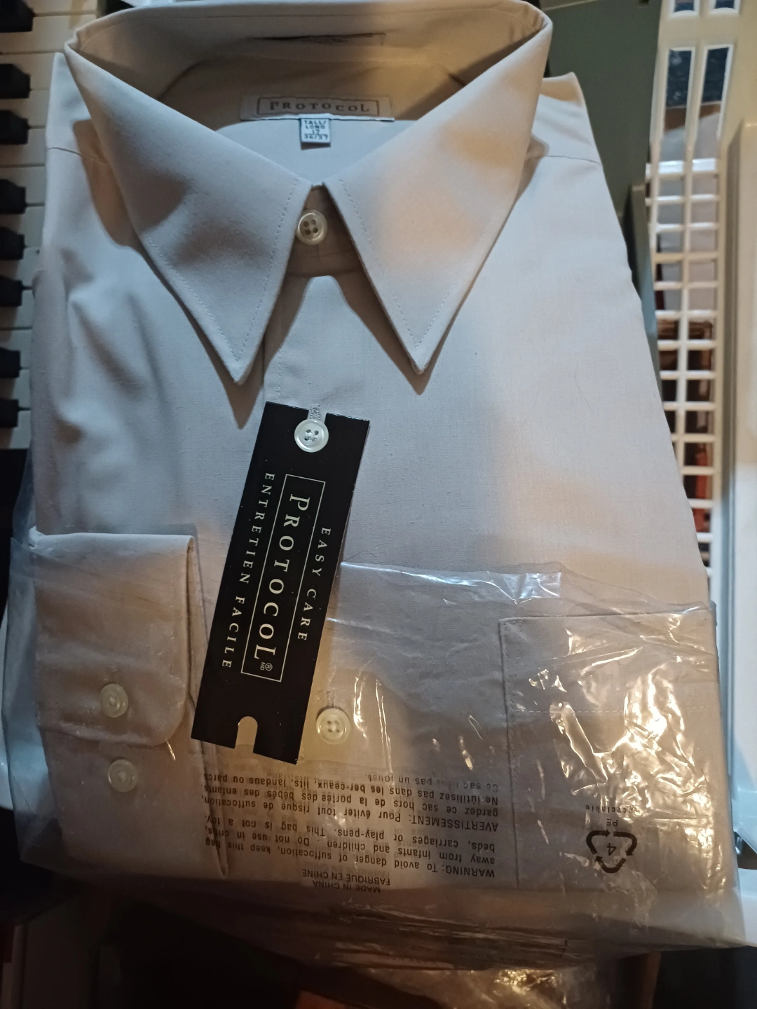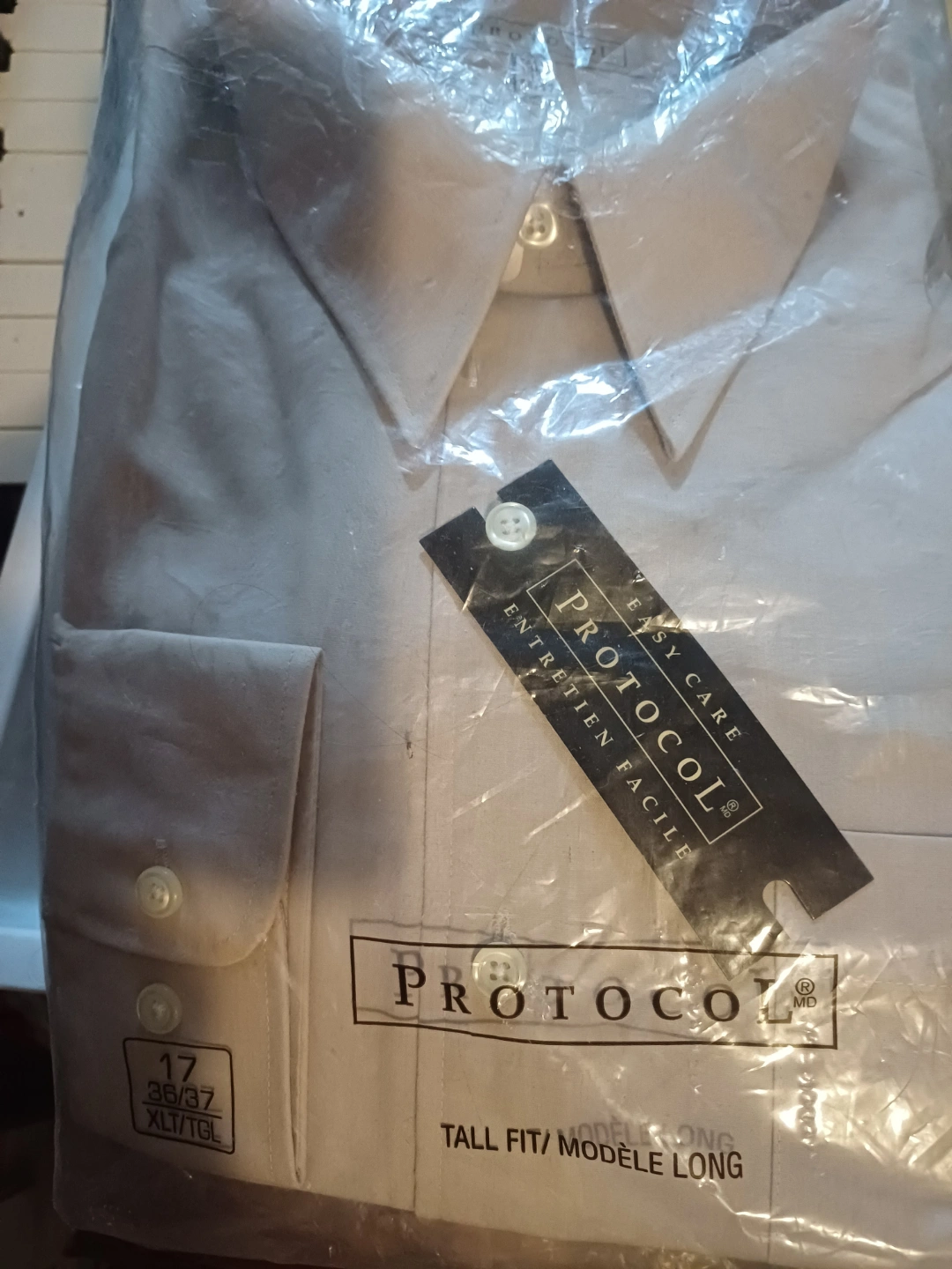 Men's Protocol brand dress shirt. Beige colour. Long sleeve. Size 17, 36/37. Tall/Long fit. Easy care. New with tags.