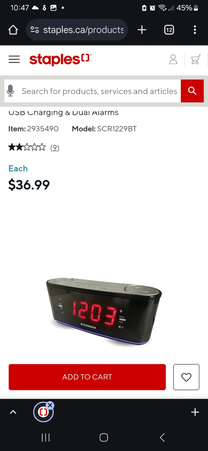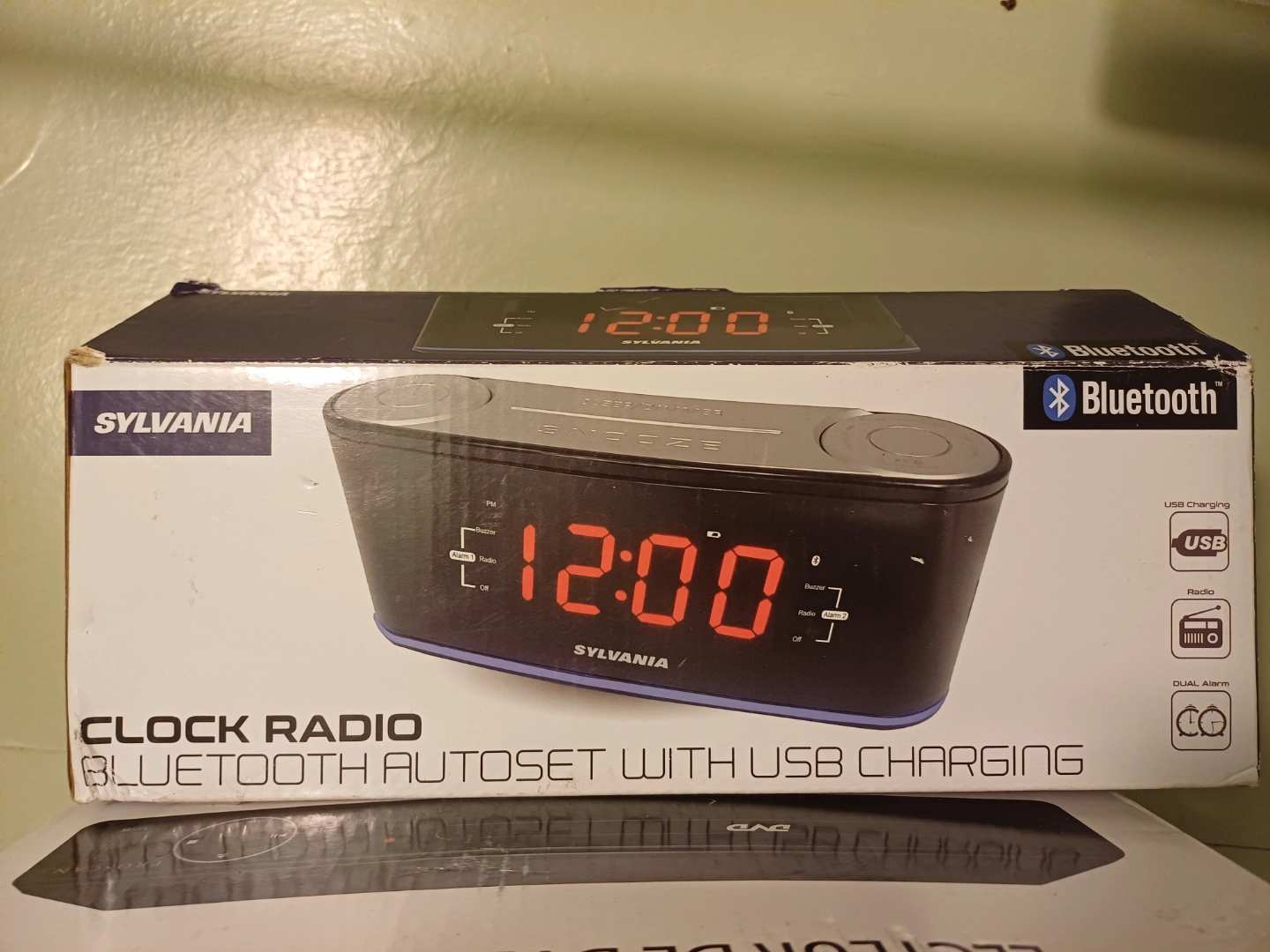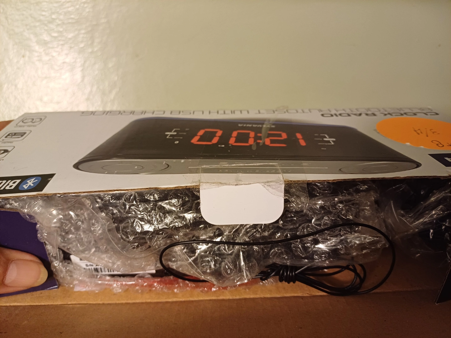 NEW in box. Features Bluetooth connectivity, USB charging port, and dual alarms. Large, easy-to-read digital display. Autoset function. Model SCR1229BT. Last picture is item on Staples site.