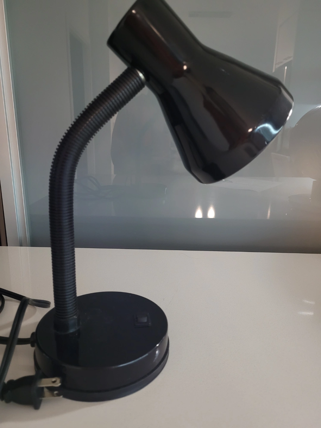 Small black desk lamp. Flexible gooseneck. On/off switch located on the base. Simple design.