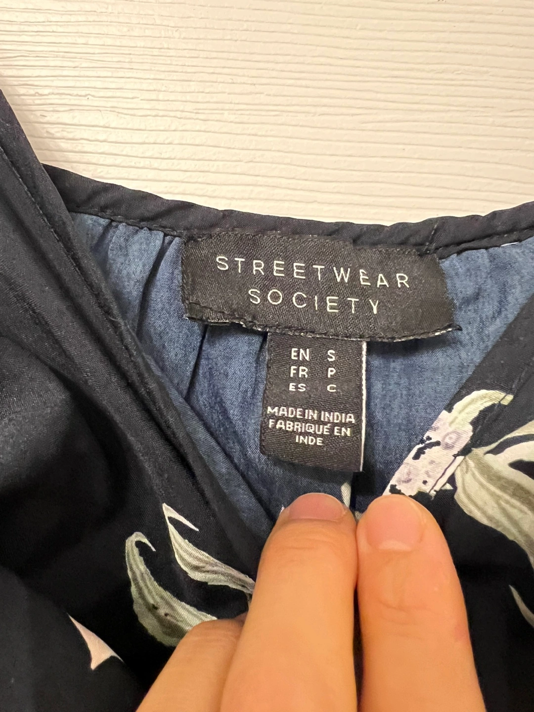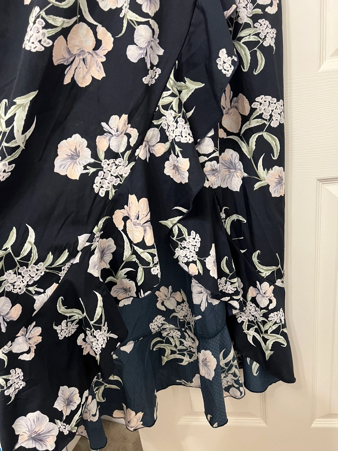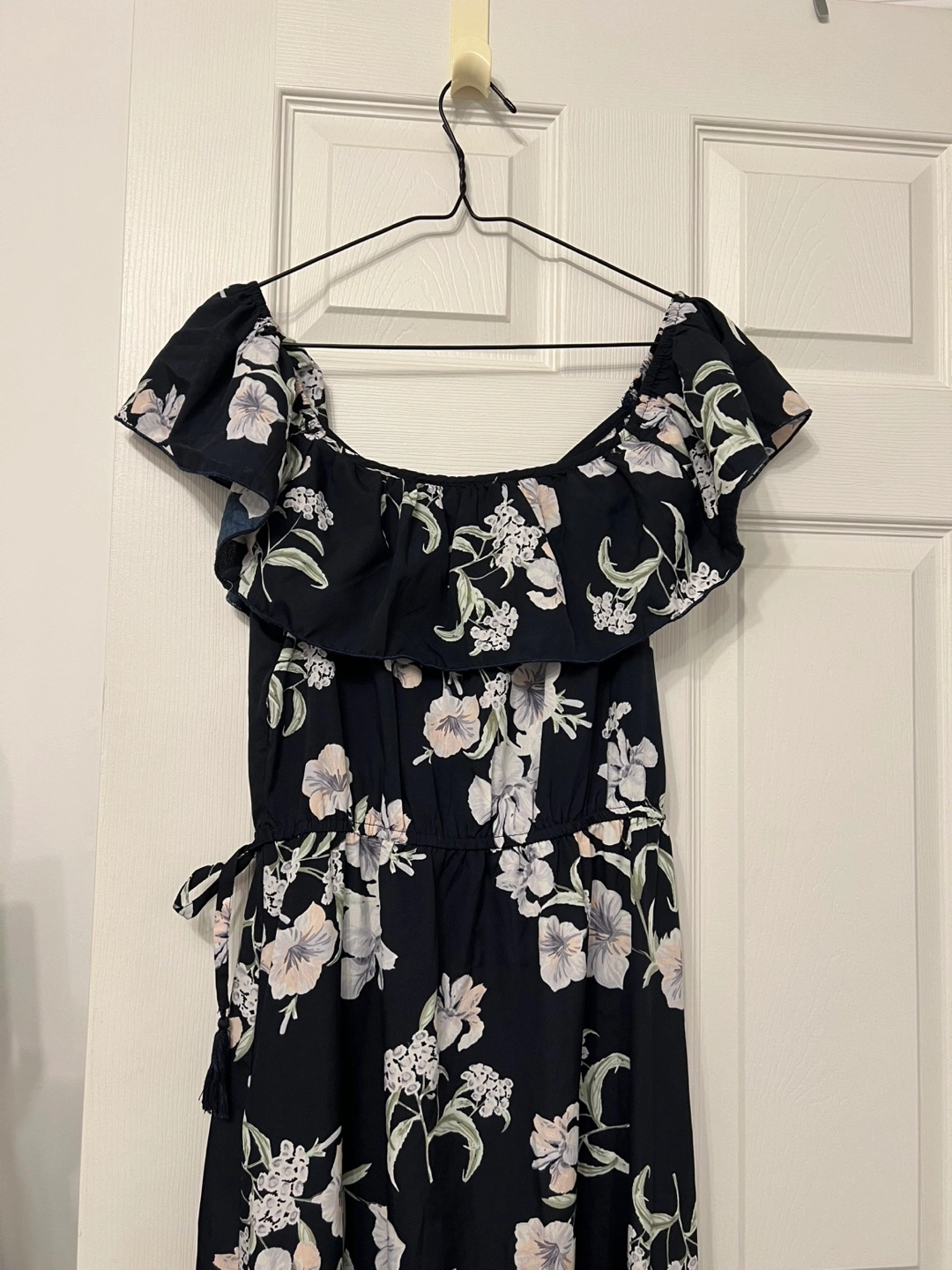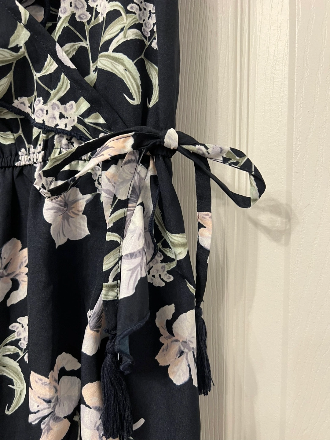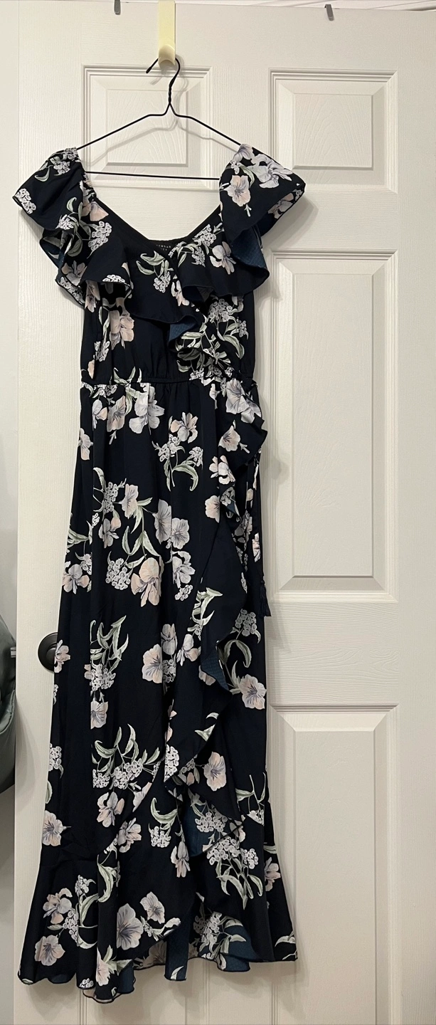 Beautiful navy blue floral midi dress. Features off-the-shoulder ruffled sleeves, wrap-style bodice, and a flowy skirt. Side tie detail with tassels. Size small