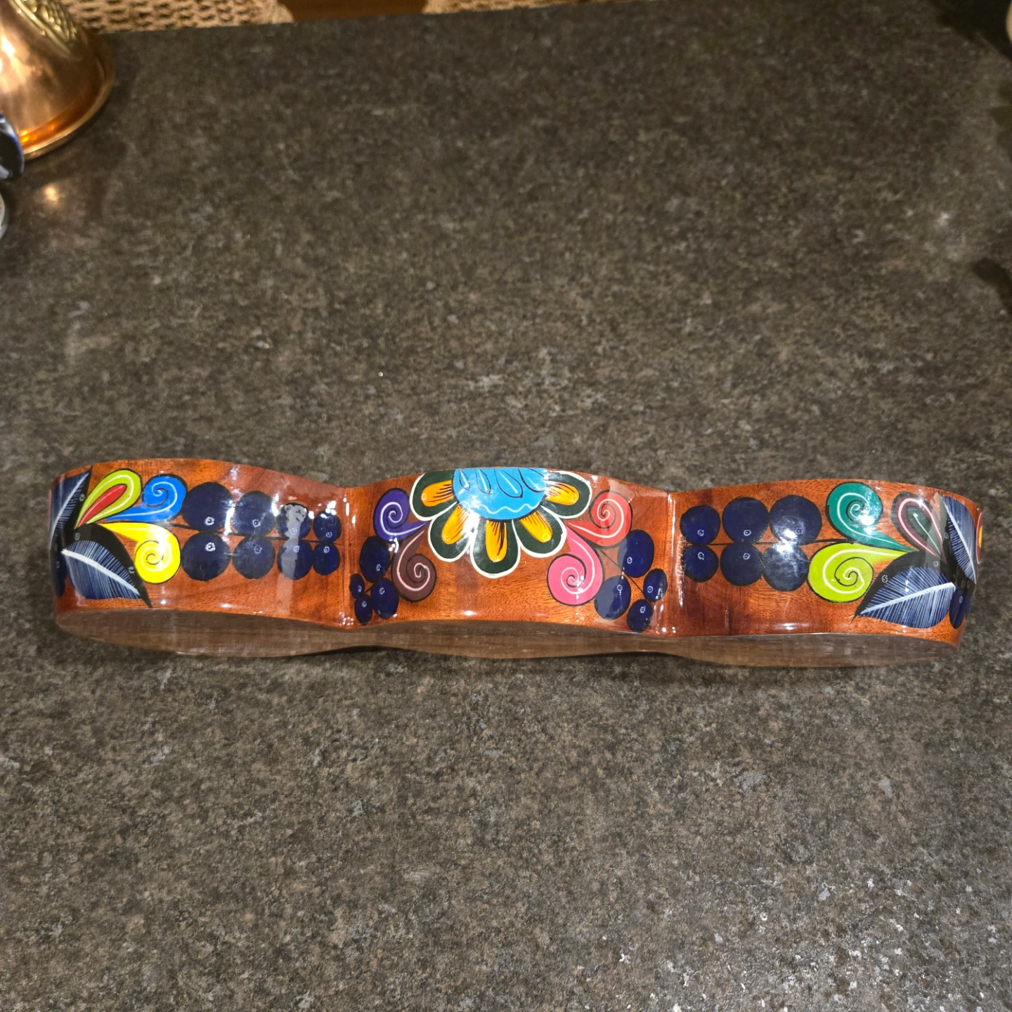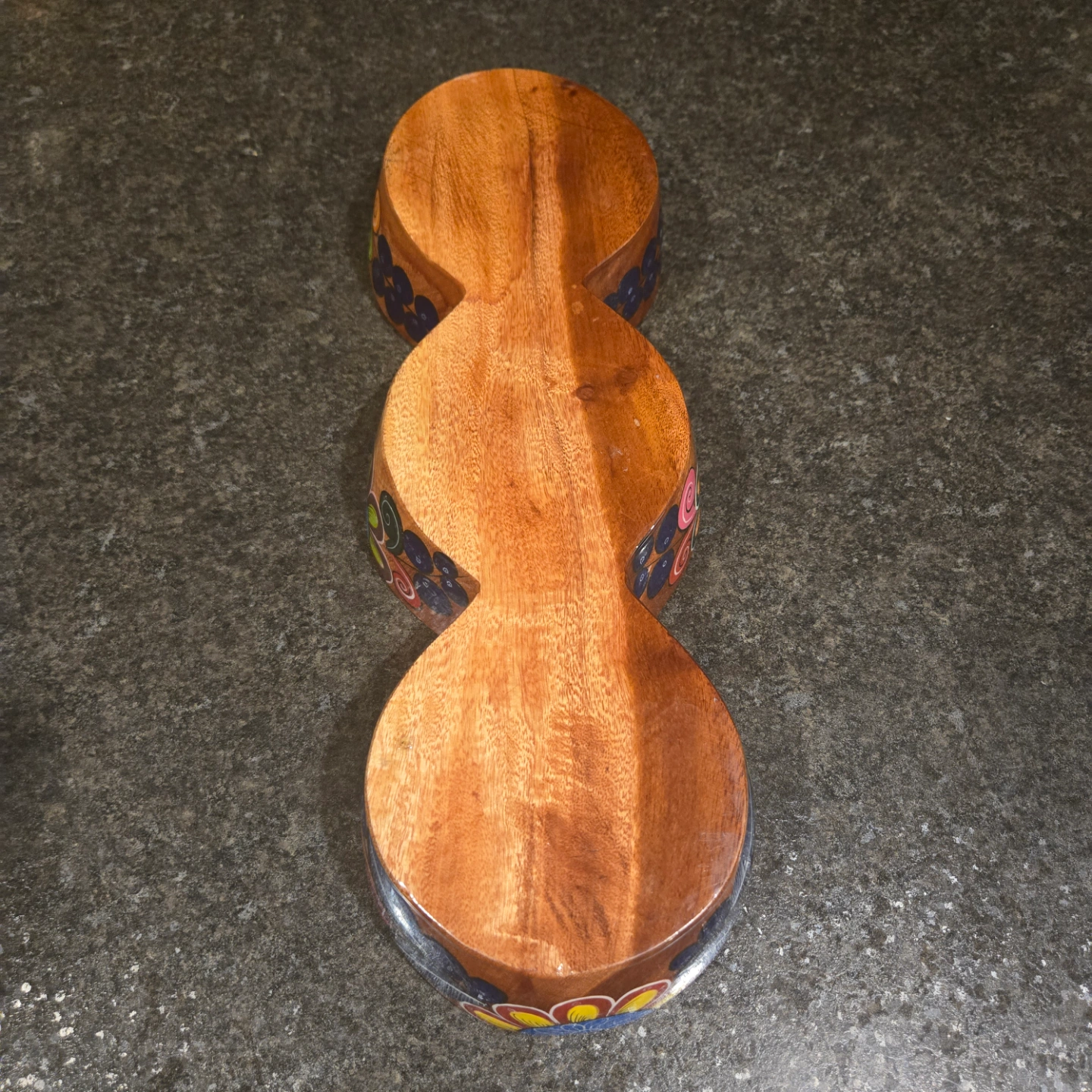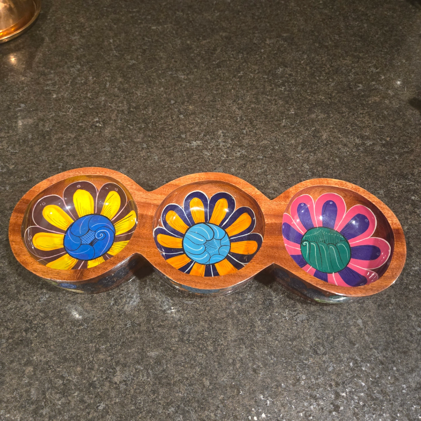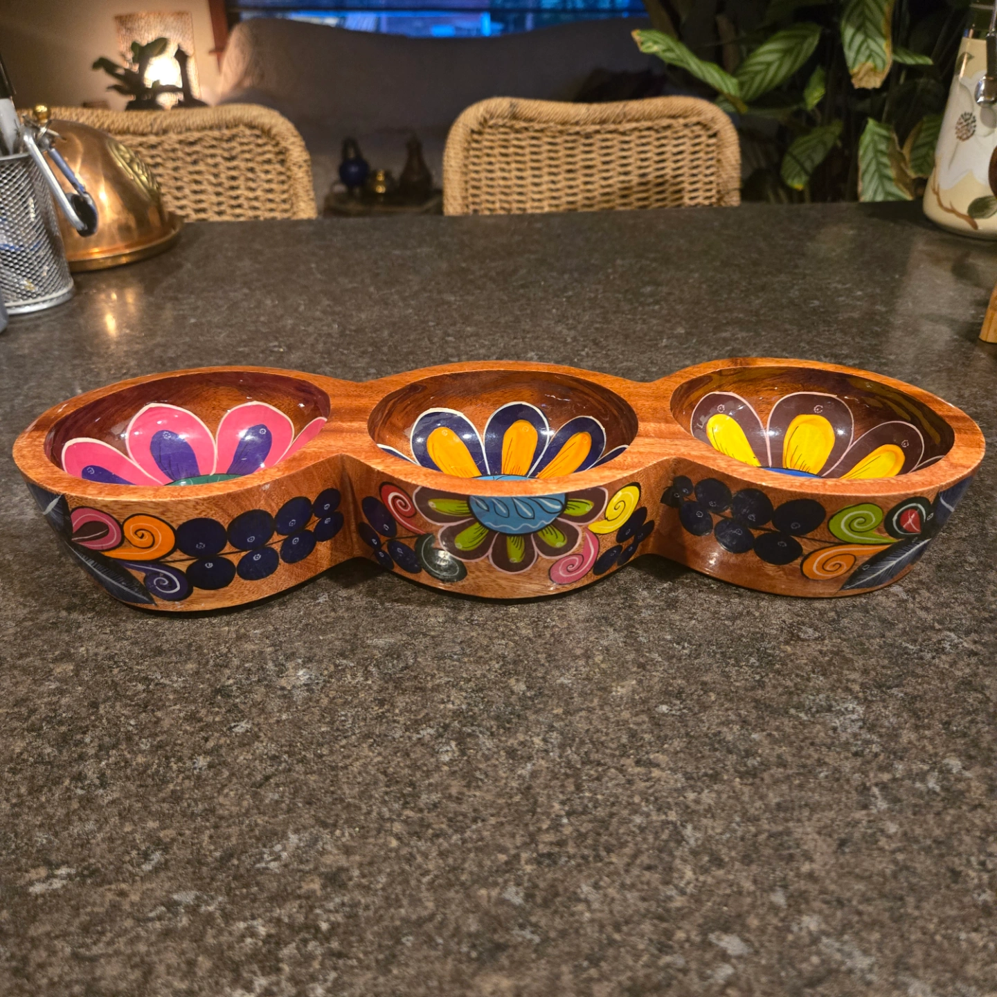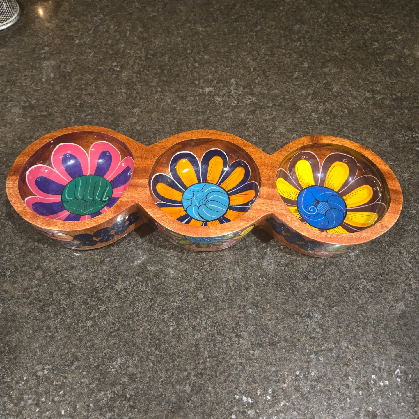 Talavera Hand Painted Mexican Folk Art Wooden Bowls 3 Connected Bowls, Made in Mexico 14.4" L x 2" D x 5" W.