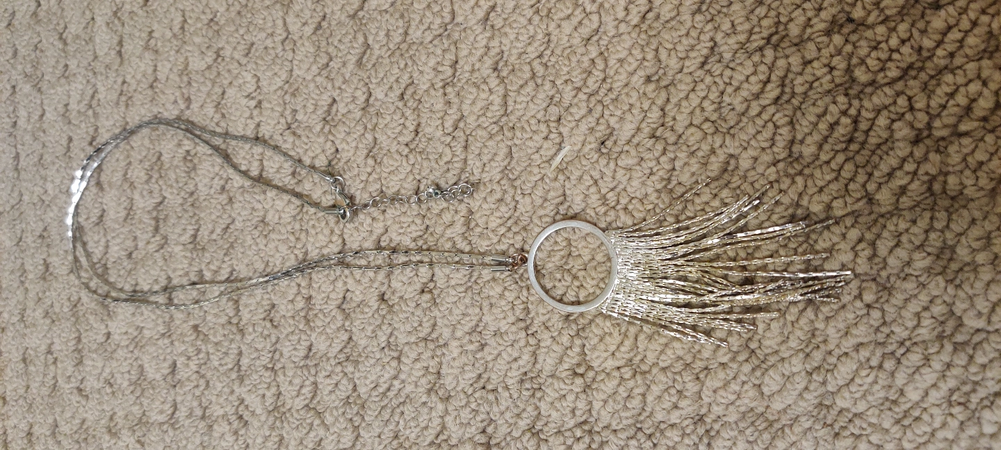 Elegant silver necklace. Features a circular pendant with a long fringe. Silver chain. Lobster clasp closure.