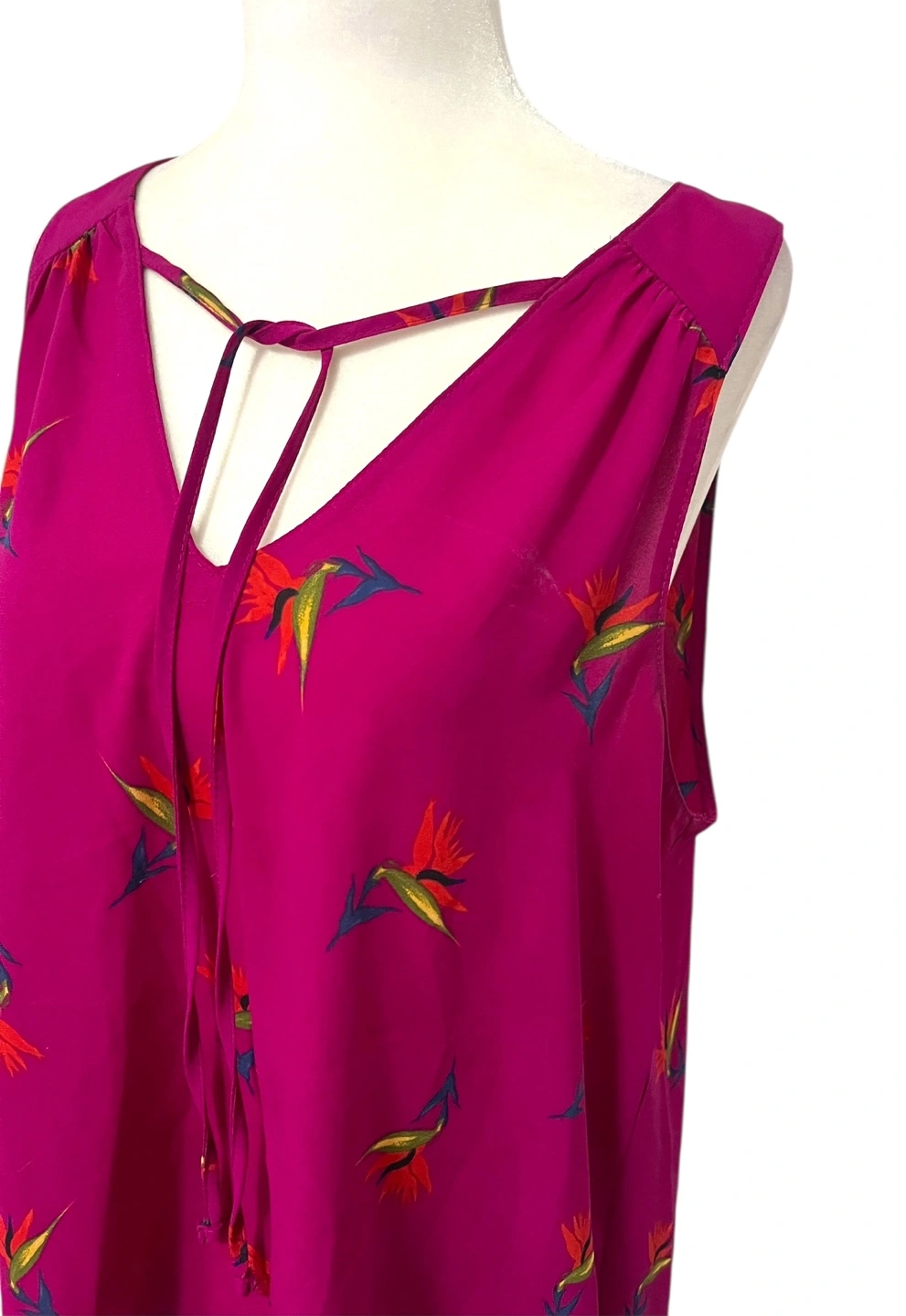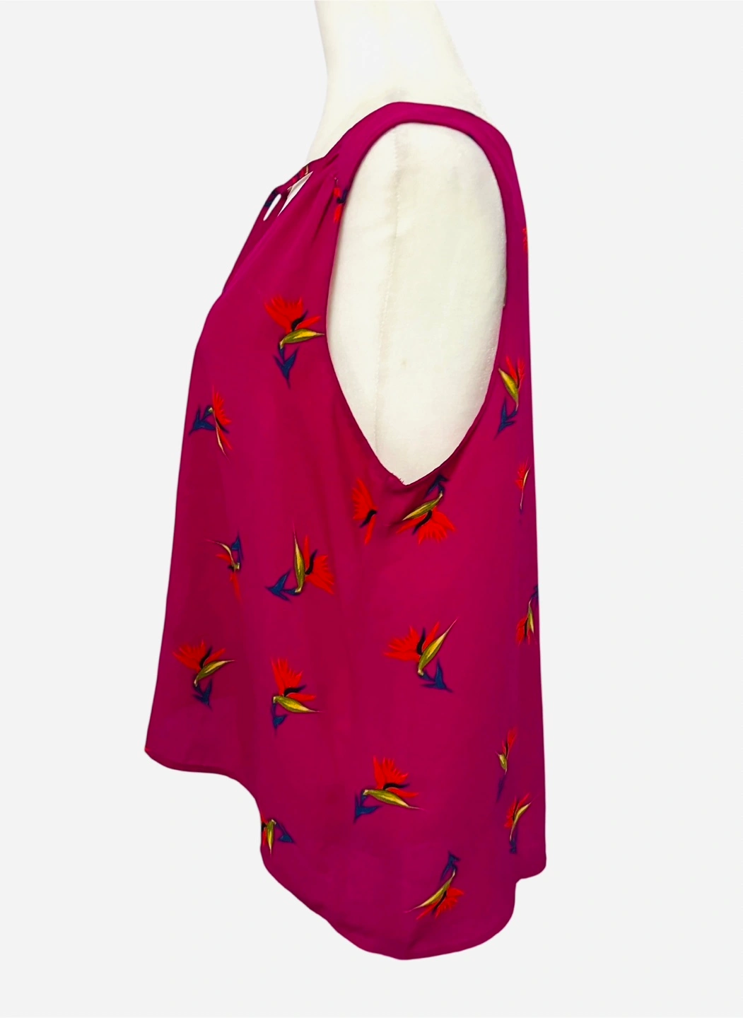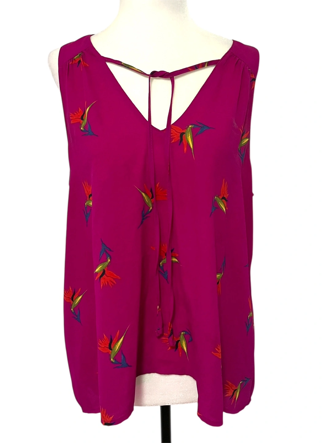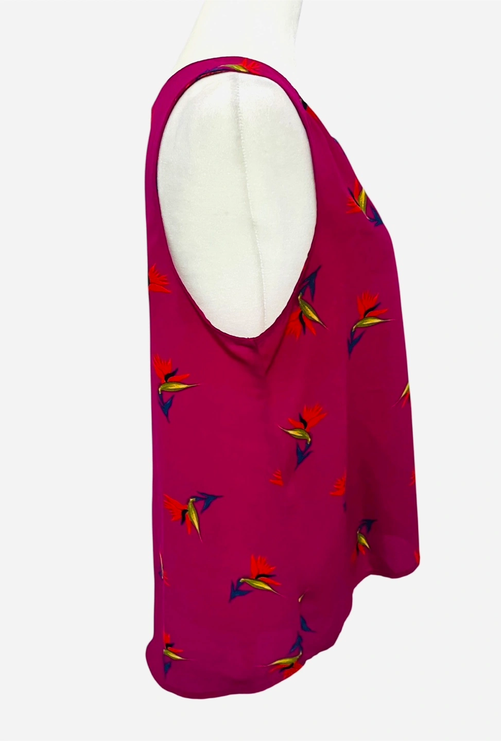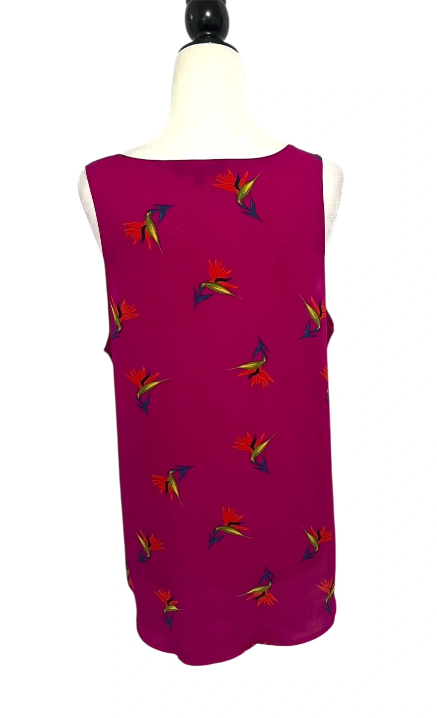 Magenta dreams unfold in this vibrant sleeveless blouse, a captivating piece that infuses your wardrobe with tropical charm. The Bird of Paradise print dances across the fabric, bringing a touch of exotic allure to your everyday style. A flattering V-neckline with delicate tie detail adds a touch of femininity, while the lightweight fabric drapes beautifully for a comfortable and chic fit. This top is perfect for adding a pop of color to your casual outings, brunch with friends, or even a relaxed vacation getaway. Color: Purple Type: Blouse Department: Women Material: Polyester Neckline: V-Neck Sleeve Length: Sleeveless Accents: Tie Pattern: Floral Features: Lightweight, V-Neck, Tie Neck, Sleeveless Fit: Regular Great Condition Length 25" Pit to pit 20" PU Ottawa & Westmount, Kitchener Keywords: George, Blouse, Top, Sleeveless, V-Neck, Bird of Paradise, Floral Print, Magenta, Tropical, Casual, Summer, Medium, Womens Top, Womens Blouse