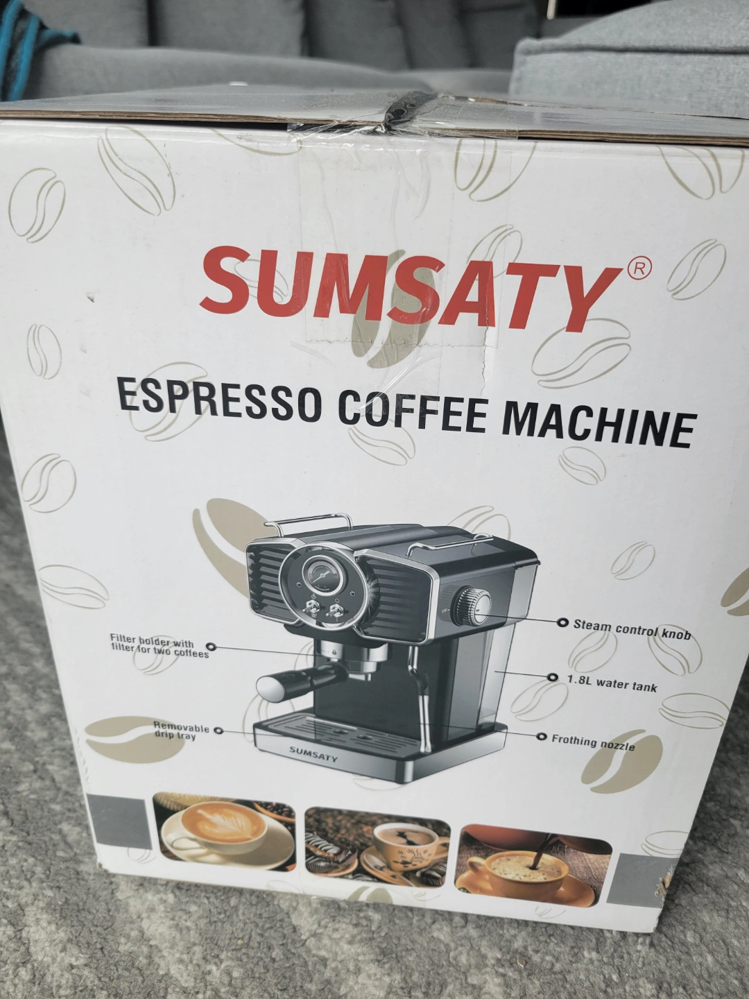 New espresso coffee machine. 1350 watts, high pressure pump. Features steam control knob, 1.8L water tank, frothing nozzle. Includes filter basket with filter for two coffees and removable drip tray. Automatic thermoblock heating system. Stainless steel and aluminum alloy construction.