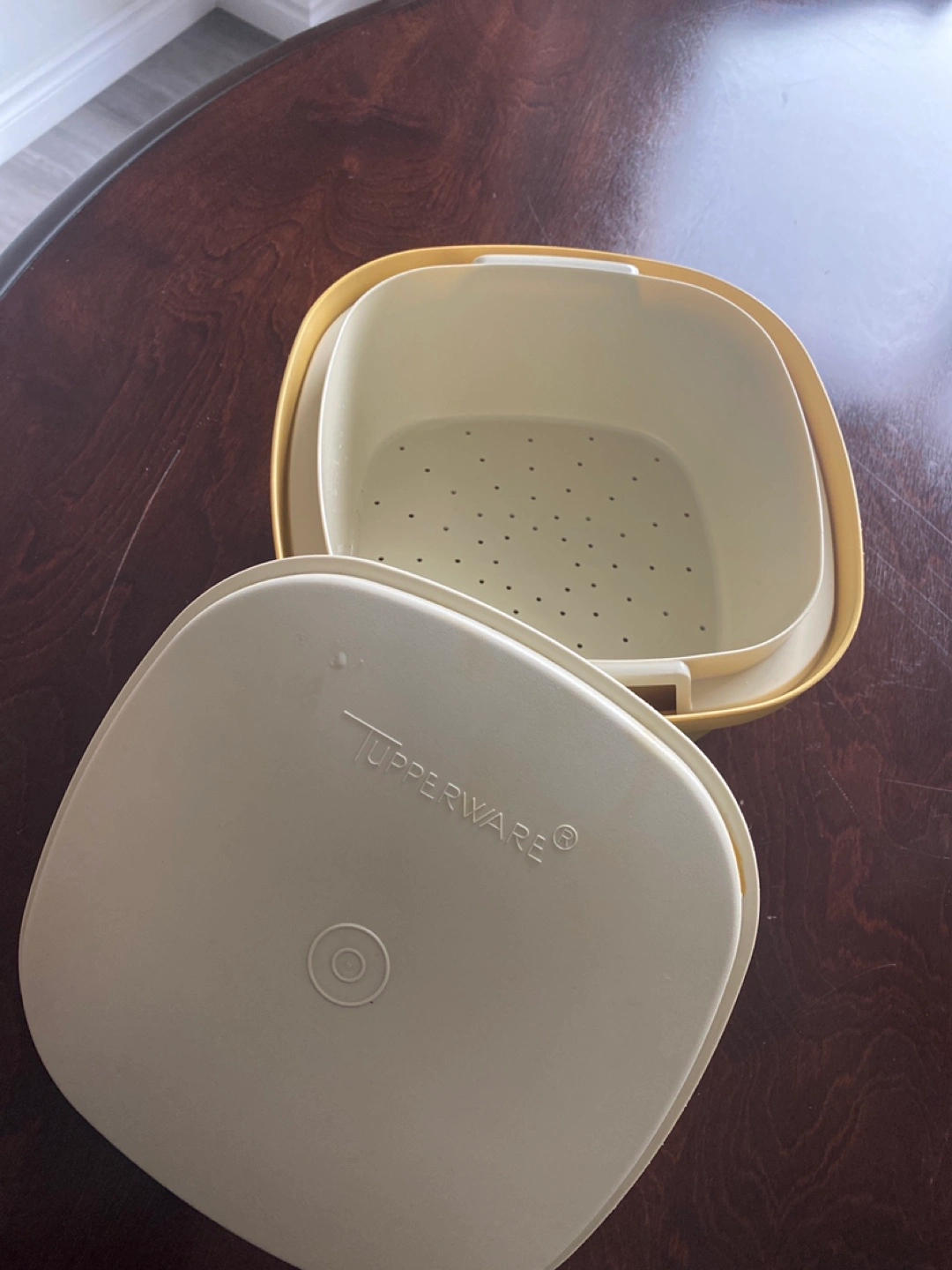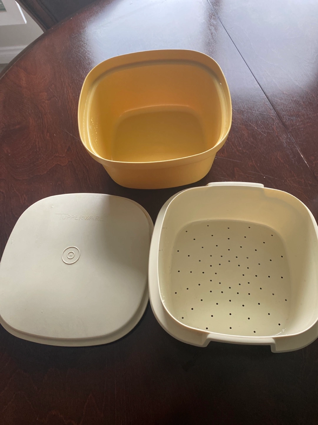 Yellow and off-white steamer. Includes a base container, insert with holes, and a lid. Great for steaming vegetables.original Tupperware . Pick up in Newmarket , no holds