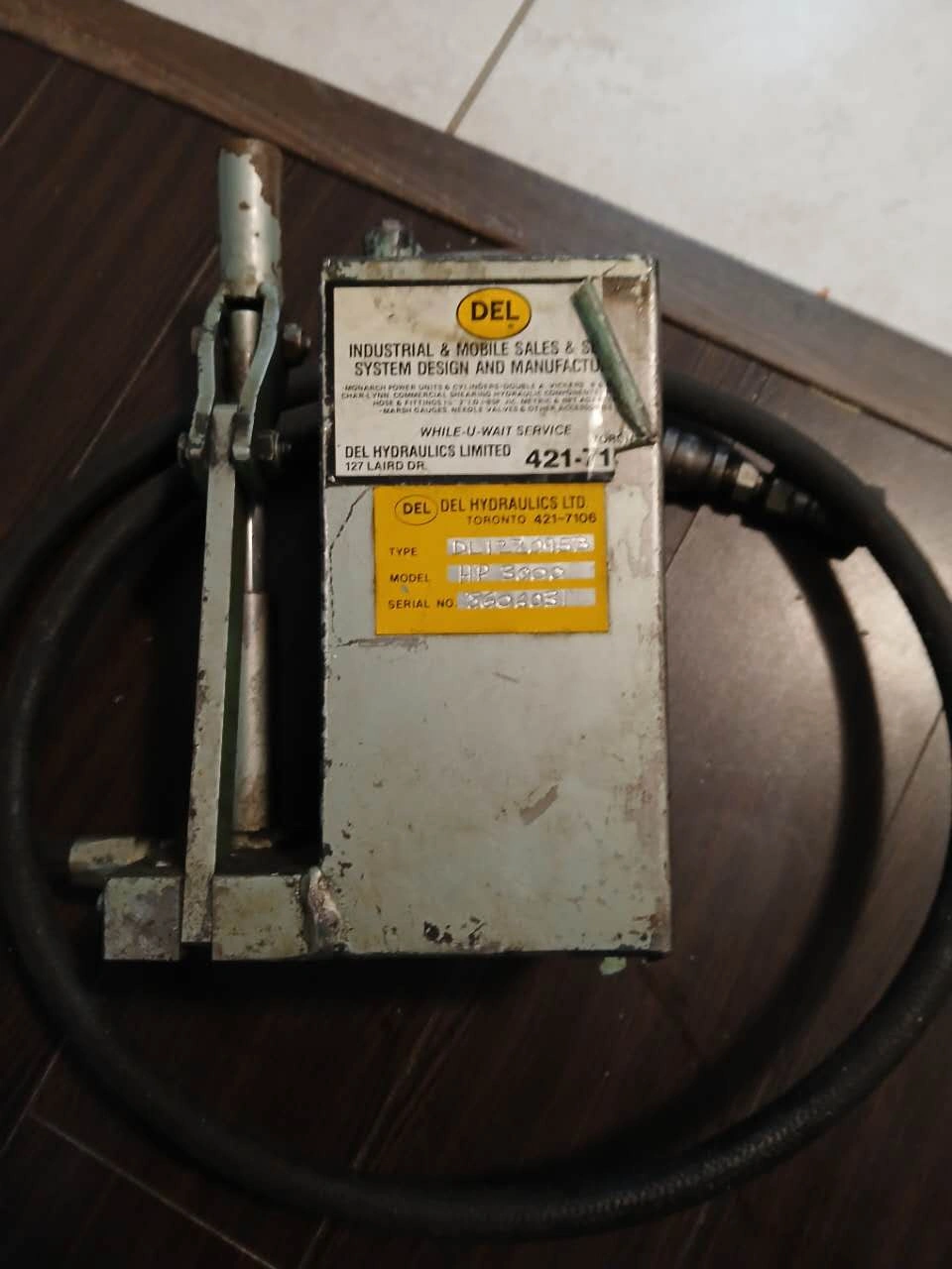 Vintage Del Hydraulics manual hydraulic pump. Model 421-7106. Includes hose. Shows wear from age and use. Great for a collector or mechanic. Cash only, Pick up only, No delivery.