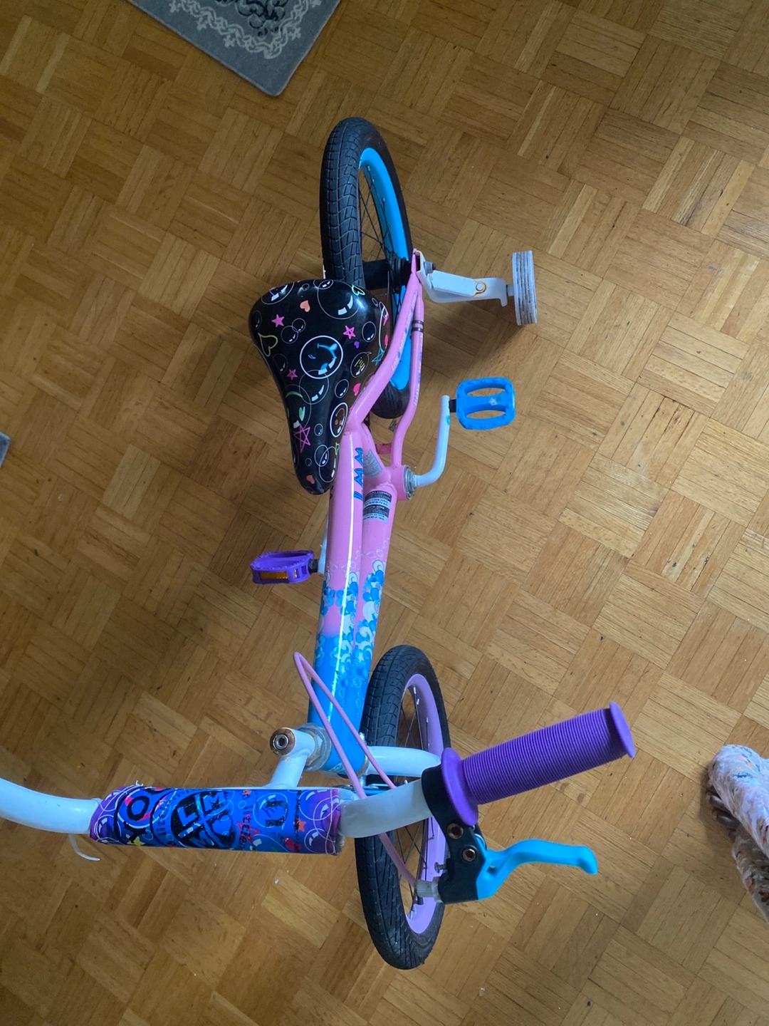 Pink and blue girls' bike. 16-inch wheels. Training wheels included. Purple accents. Fun design.