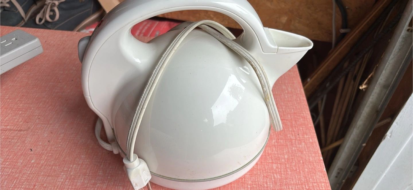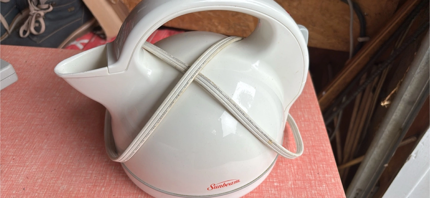 White electric kettle. Cord wraps around the base. Great for a retro kitchen or collector.
