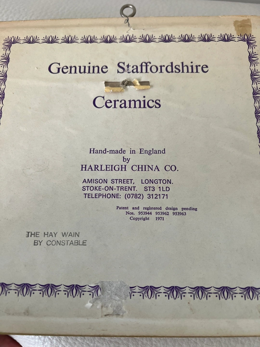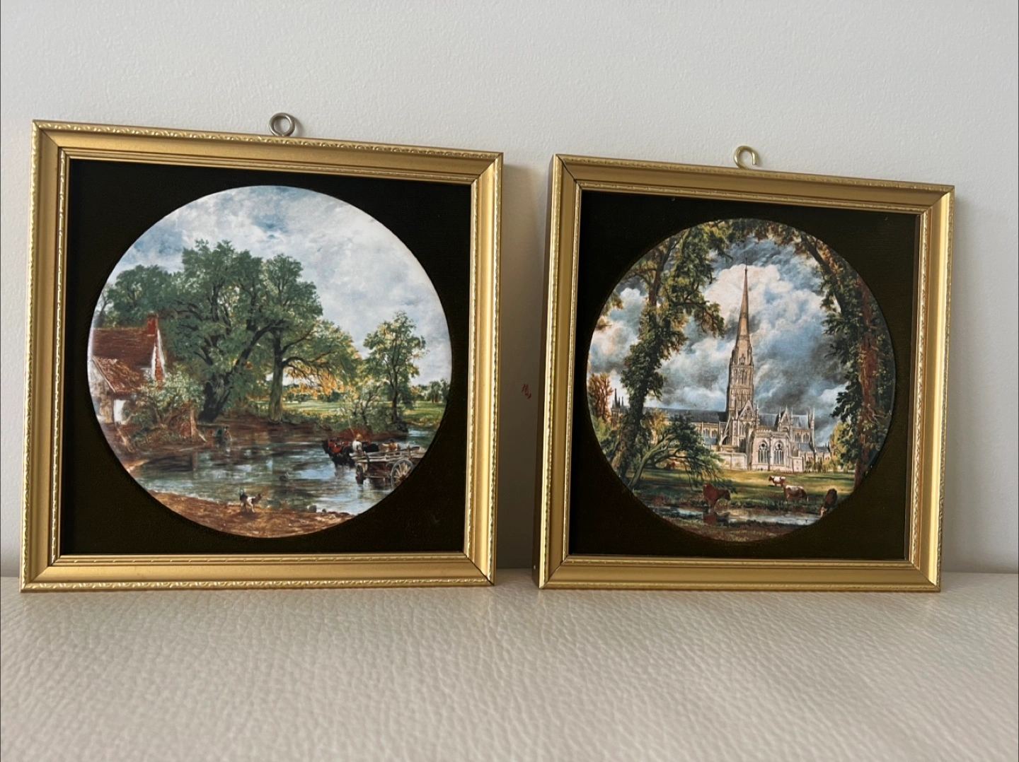 Two framed circular ceramic plaques. Picturesque landscape scenes. Gold frames. Hanging hardware. Genuine Staffordshire Ceramics. Hand-made in England by Harleigh China Co. Copyright 1971. Price offered for both!