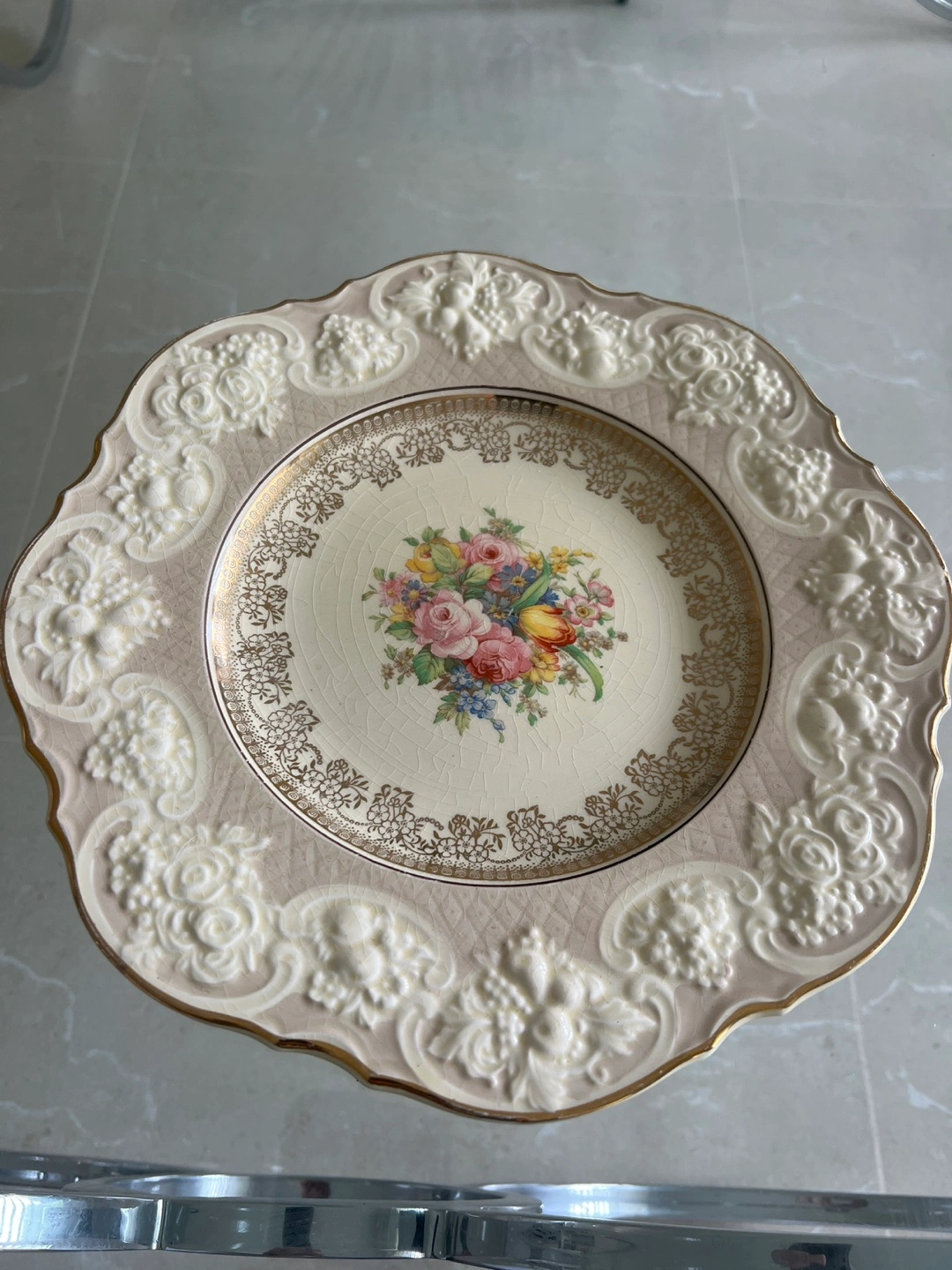 Beautiful vintage plate. Cream coloured with embossed detailing and floral centrepiece. Gold accents. Shows some age and wear.