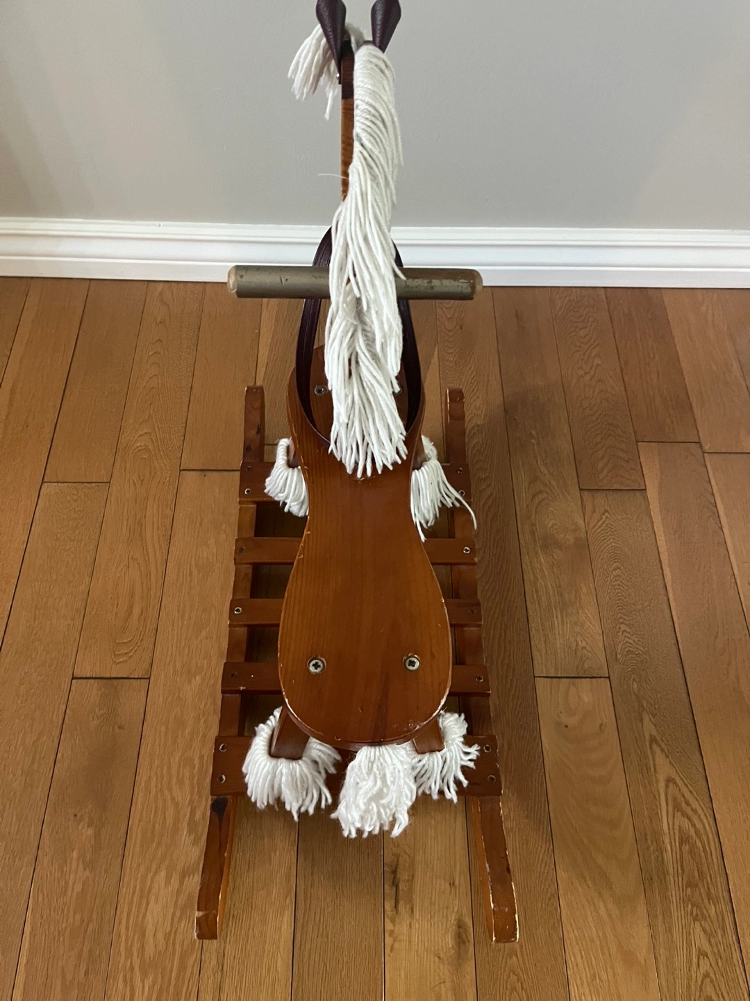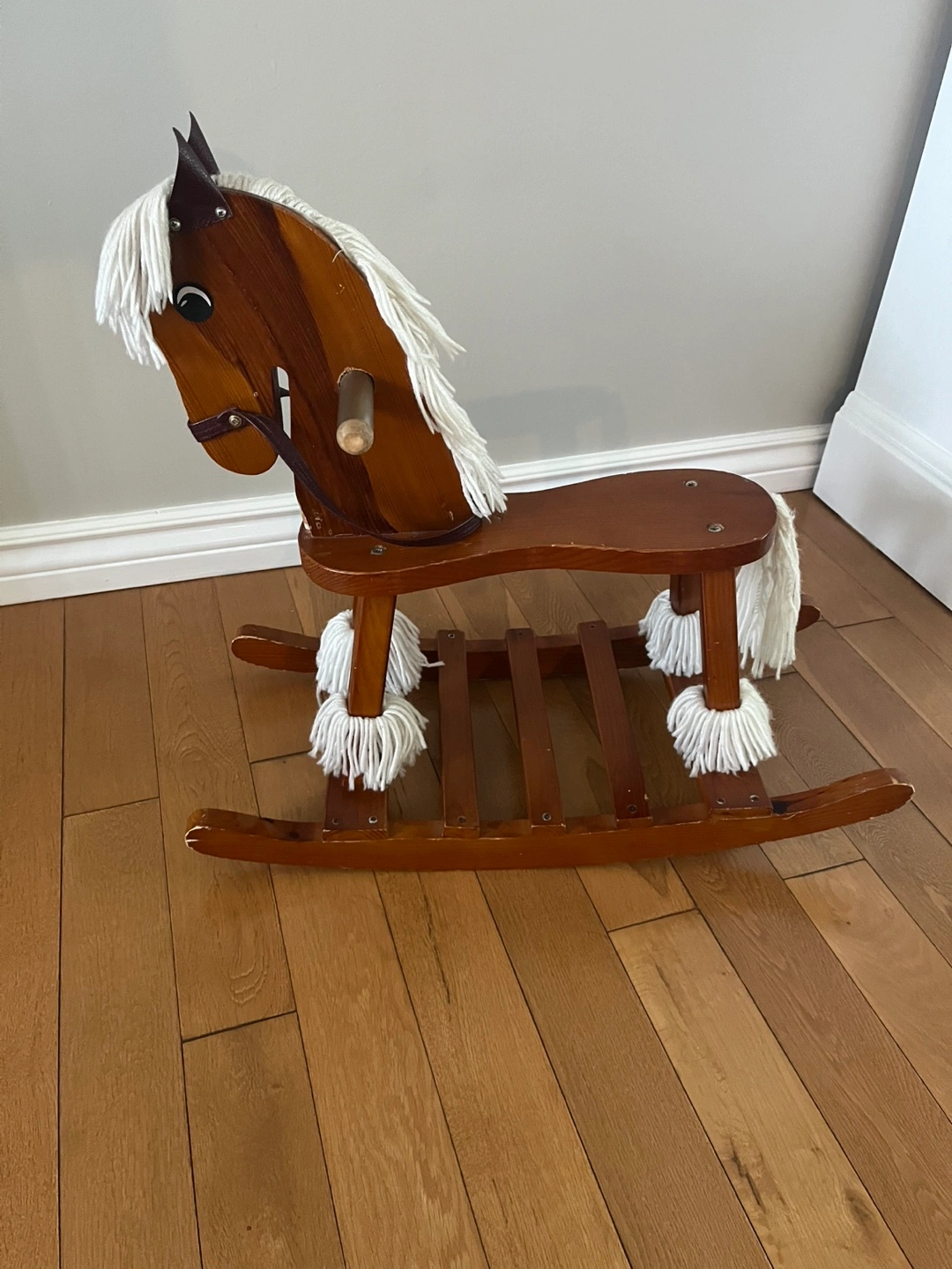 Pick up in Utopia. Charming vintage wooden rocking horse. Features a wooden body, white yarn mane and tail, and a simple design. Shows some minor wear consistent with age and use-see pictures. 24” in length, 21” in height.