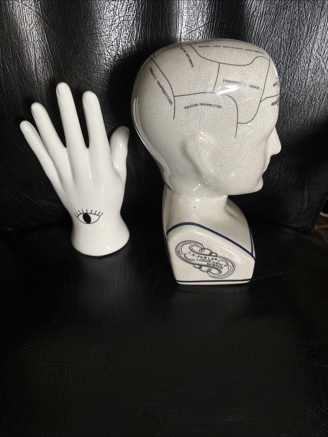 Pair of ceramic figurines. One a phrenology bust by L.N. Fowler, the other a hand. Unique collectible items. Shows signs of age. From my days of playing psychic. - I’m moving and have to sacrifice some of the fun stuff Available by appt for pick up at 1421 Bloor Street West - inside Martin Espresso Cafe