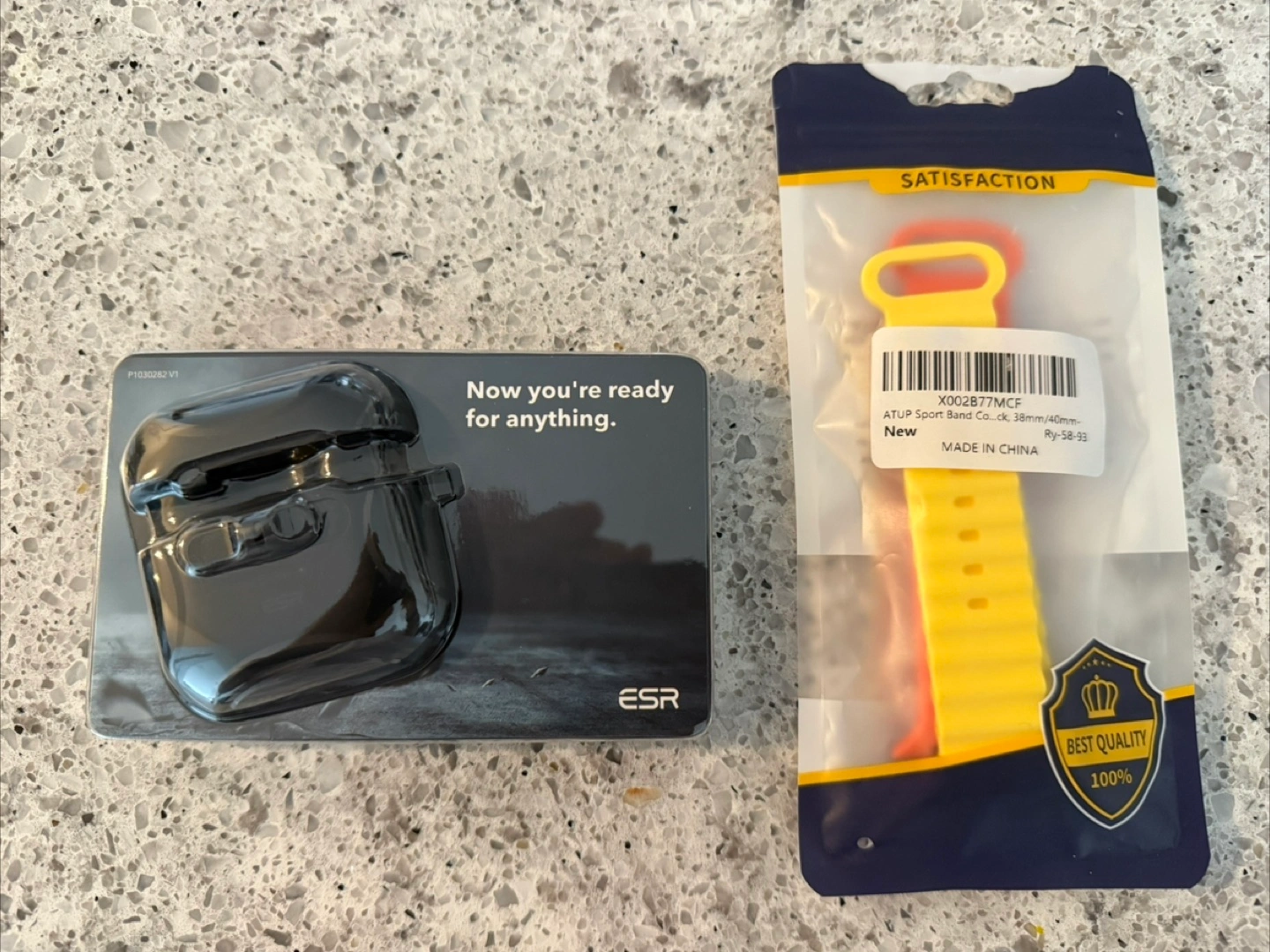 1x ESR Cyber Air pods 4 case with closing clip with original adhesive (case not used) - Available 2x Silicon straps (yellow and orange) for 49mm apple watch - SOLD as a free separate sale Pickup: Walmart hays blvd Oakville/Oakville Go station