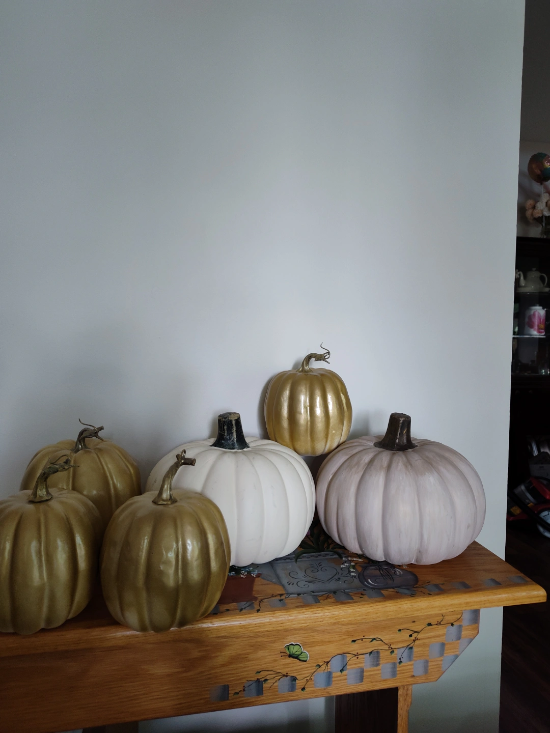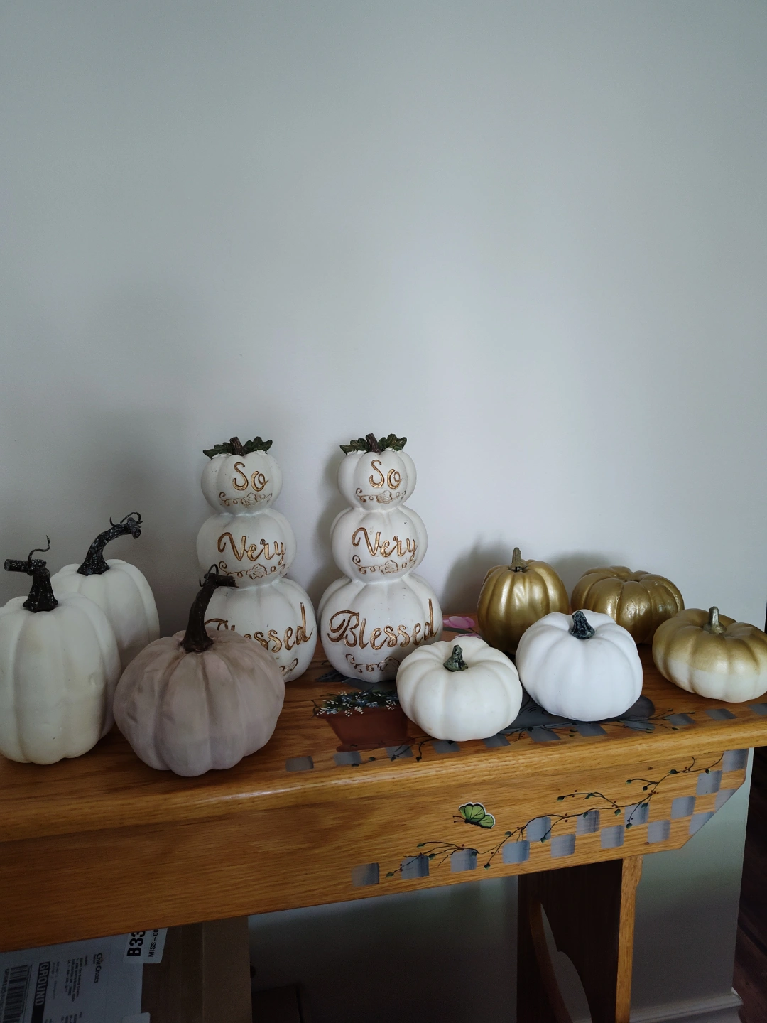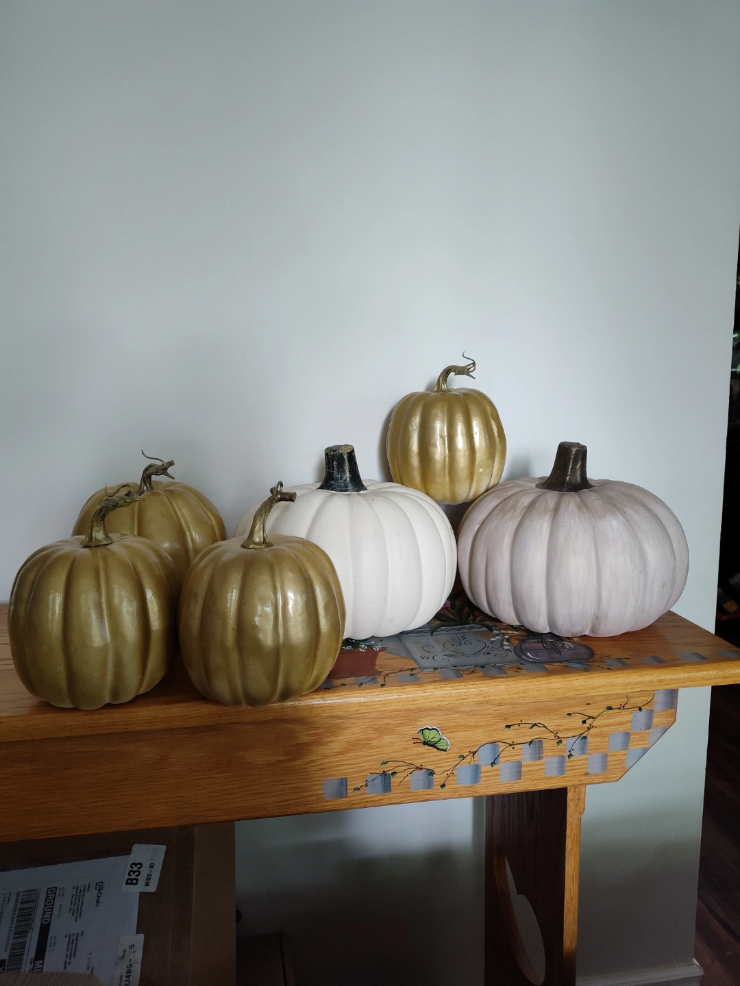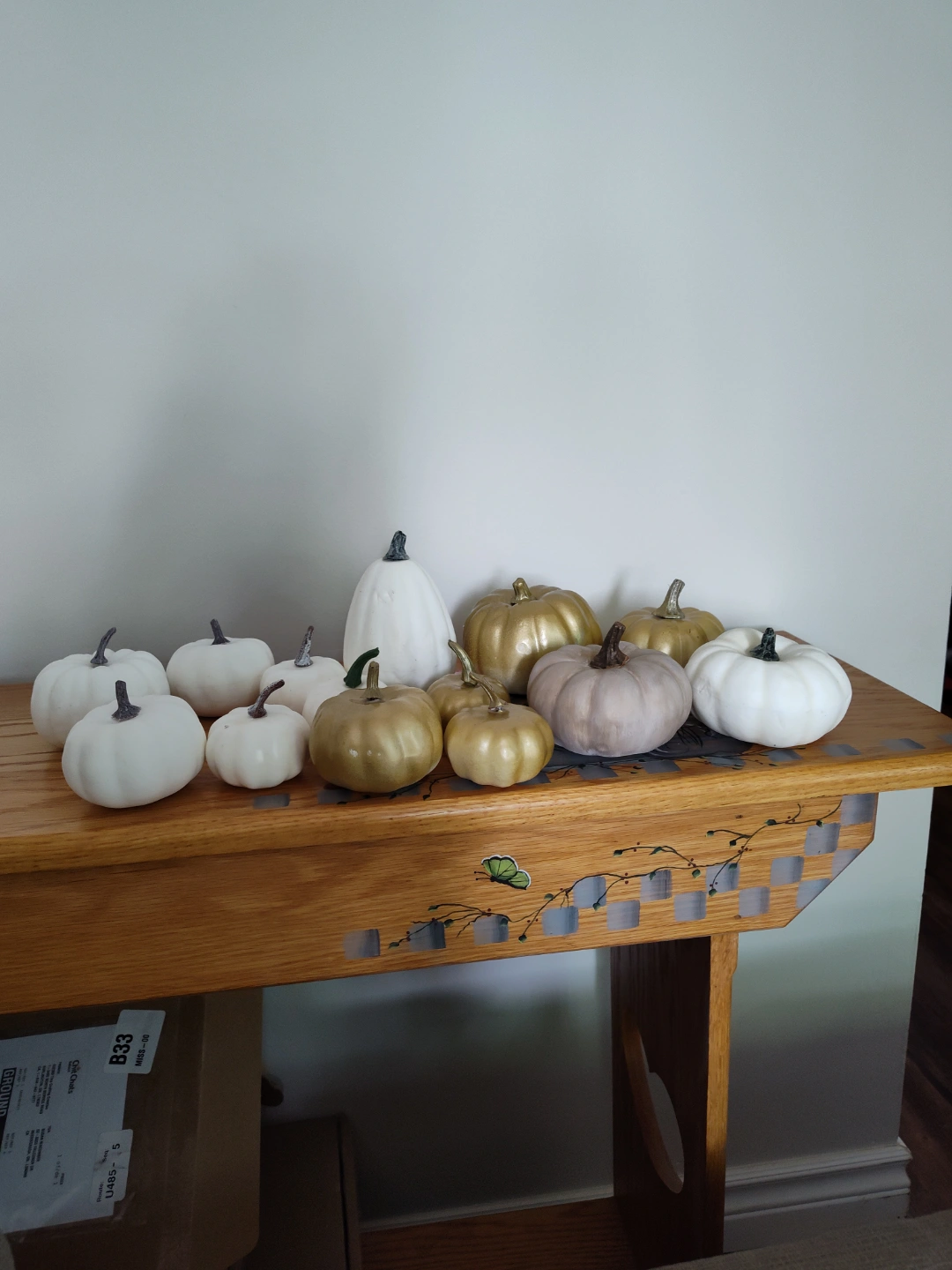 Collection of various sized pumpkins. Includes gold and white pumpkins. Some pumpkins are stacked to form a decorative tower. Perfect for autumn decorating. 45 in total. can be painted. Cash only, p/u Streetsville