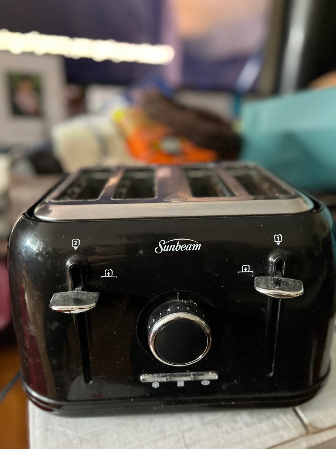 Black four-slice toaster. Features adjustable browning control and extra-wide slots. Shows some minor signs of use. FASTEST PICKUP!!!