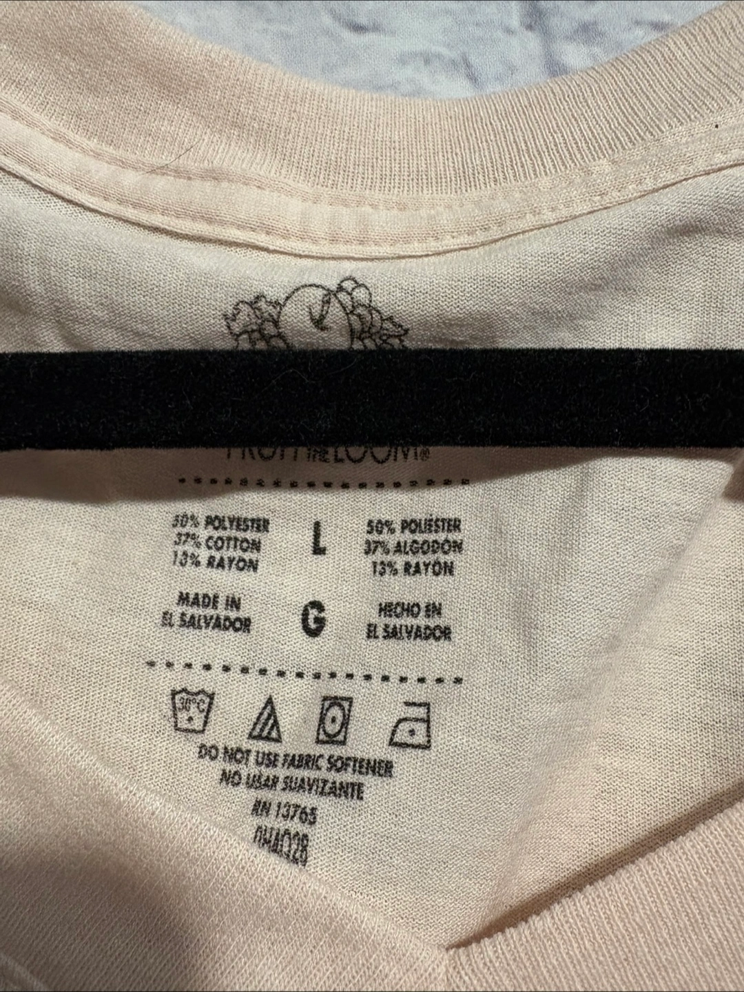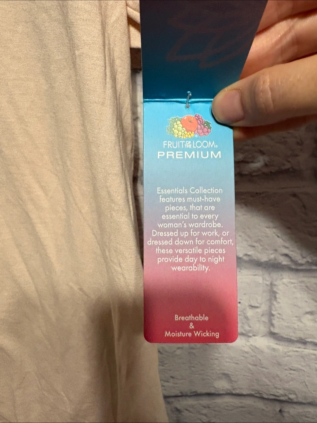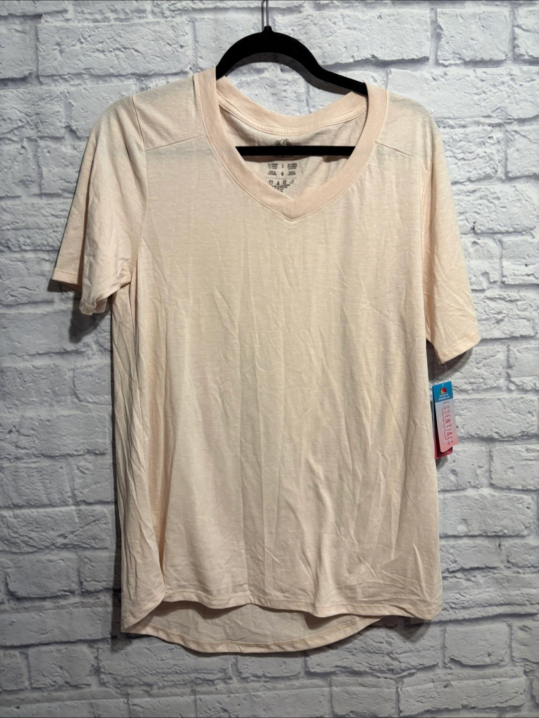 Women's V-neck, short sleeve t-shirt. Size large. Light beige/peach colour. Made in El Salvador. 50% polyester, 37% cotton, 13% rayon. Breathable and moisture-wicking. New with tags, retail is $20. Pick up only.