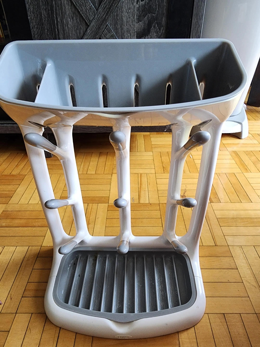 Grey and white plastic bottle drying rack. Features multiple bottle pegs and a tray. Good for drying baby bottles, sippy cups and more.