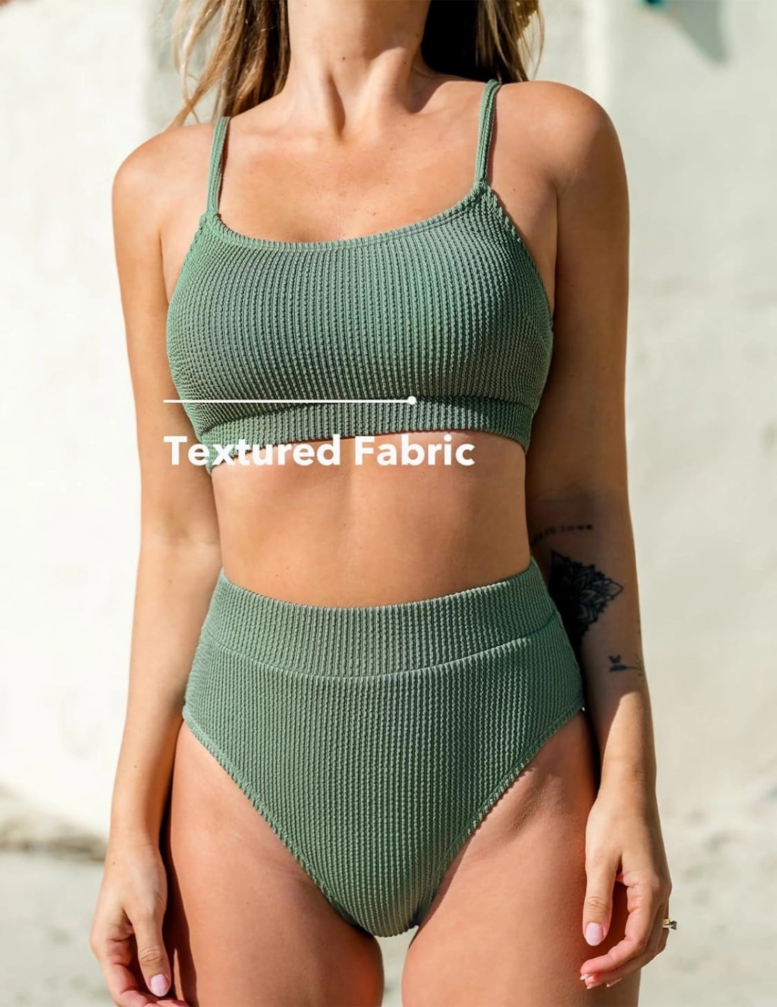 Olive green textured bikini. High waisted bottoms. Adjustable straps, padded cups (removable). New with tags. Smoke free home. Retail: $40