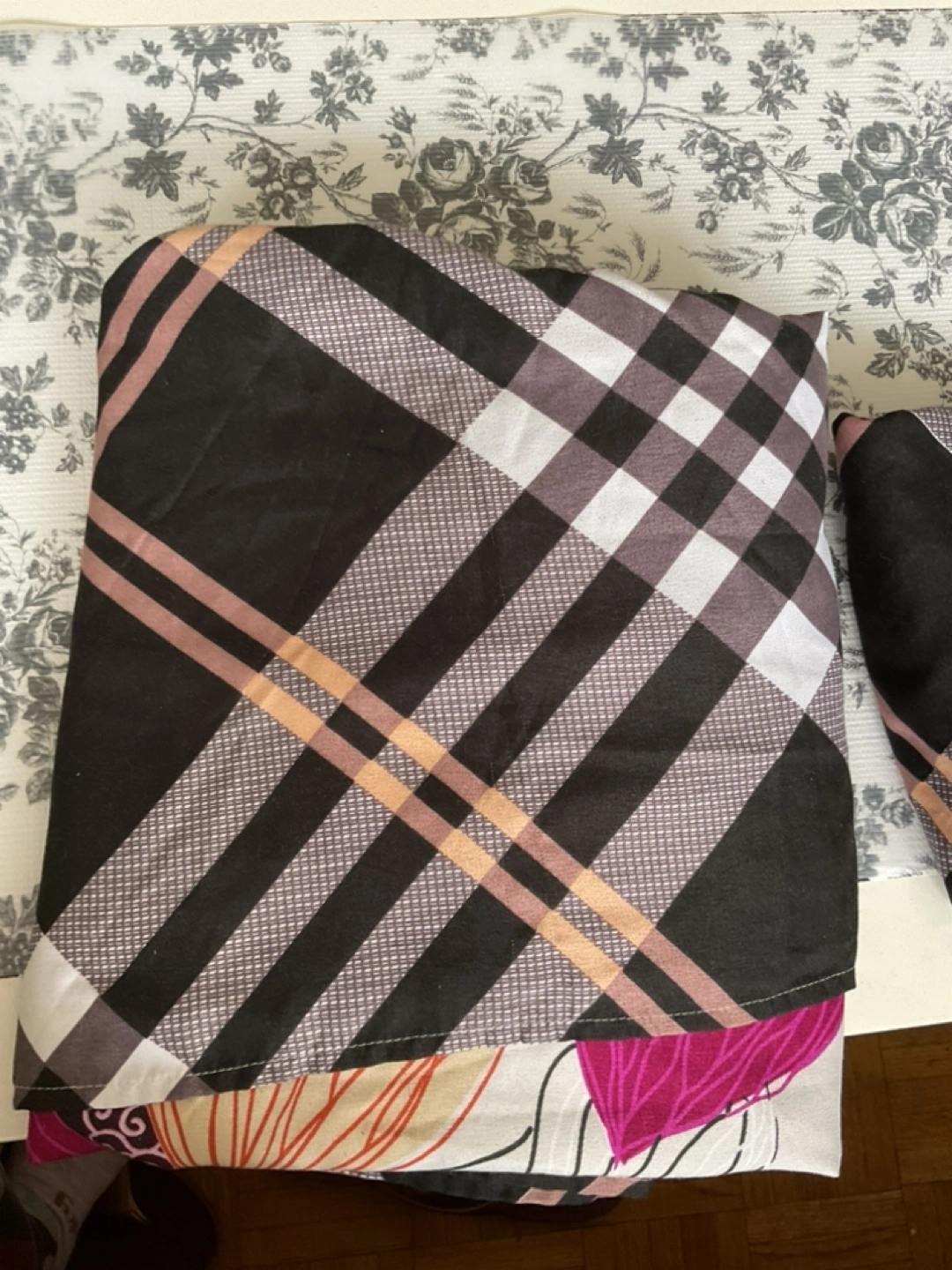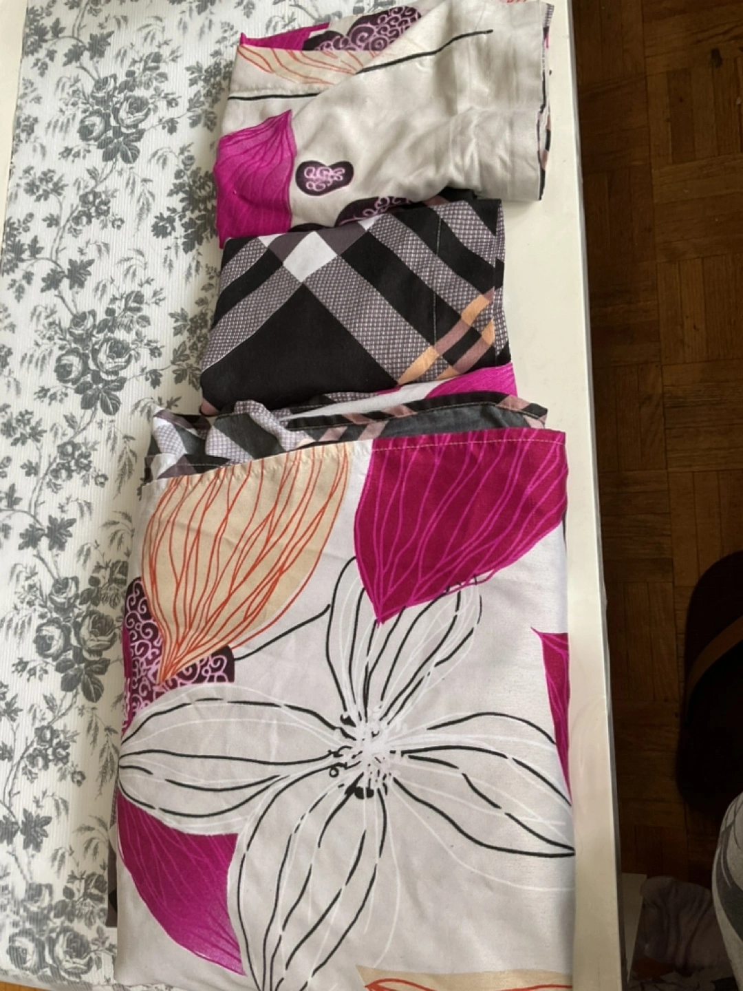 Three-piece duvet cover set. Features two different patterns: a floral design and a black and white plaid. Excellent condition. Soft and comfortable material. Perfect for adding a touch of elegance to your bedroom.