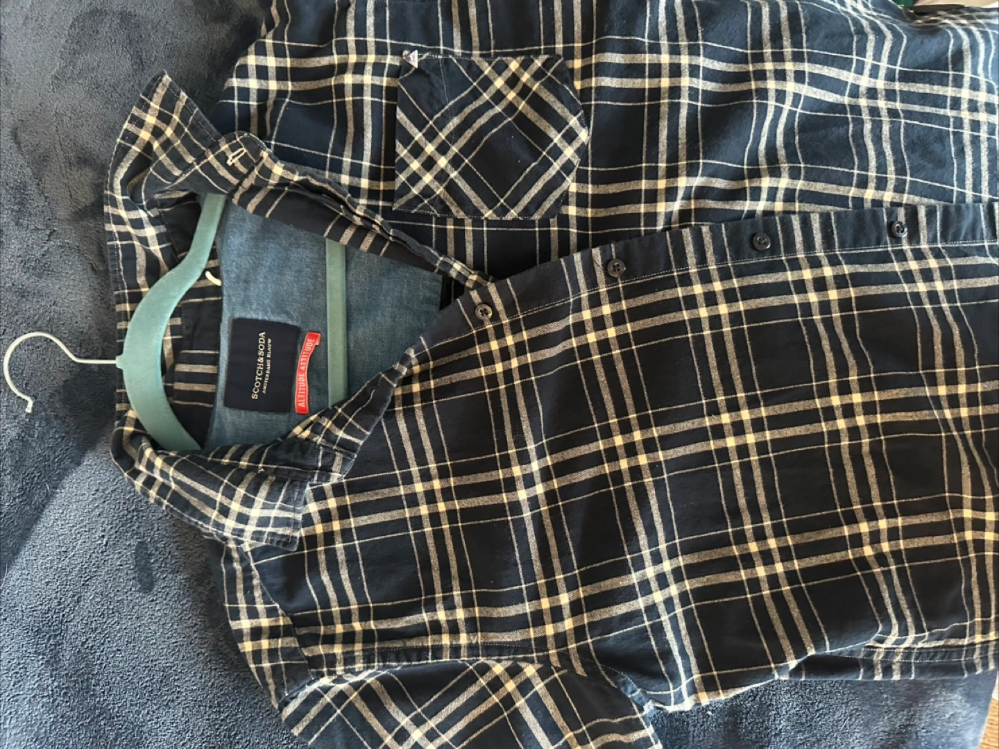 Men's long-sleeve button-down shirt. Navy and cream plaid pattern. Classic fit. Chest pocket. Excellent condition.
