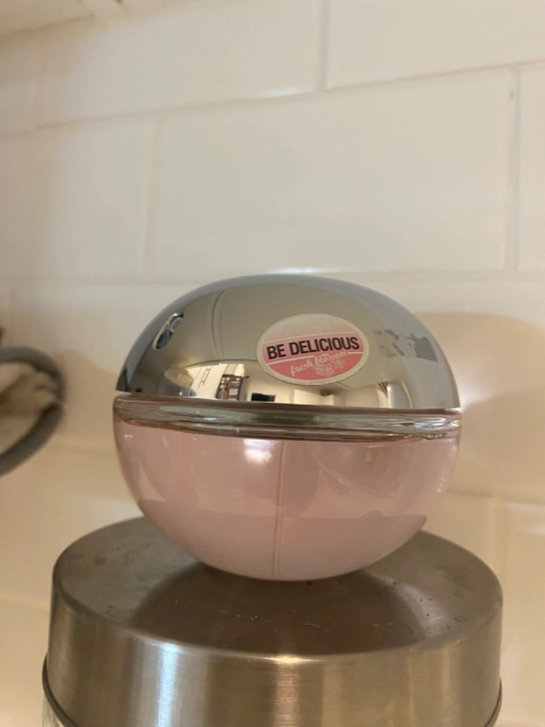 Be Delicious Fresh Blossom perfume. Pink perfume in a silver orb-shaped bottle. New.