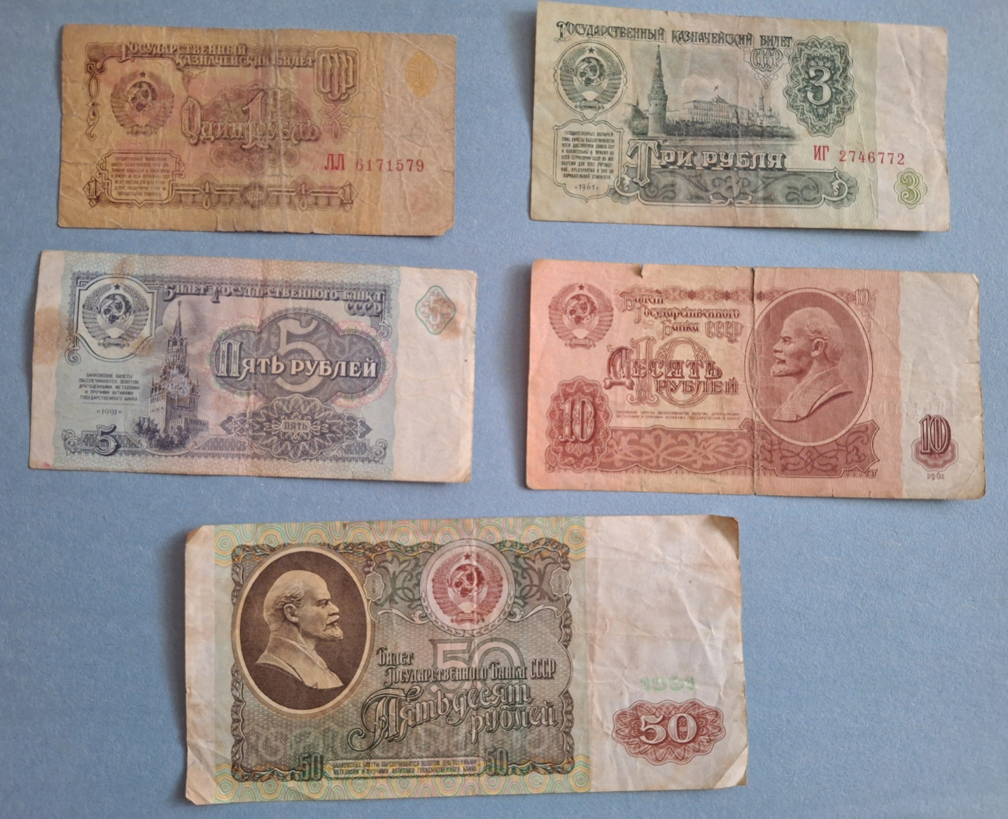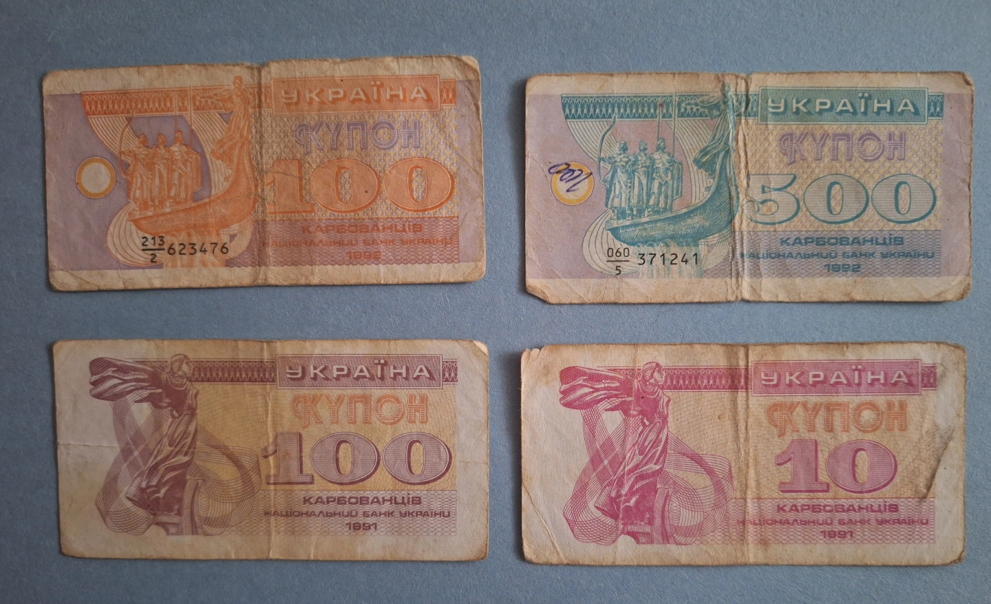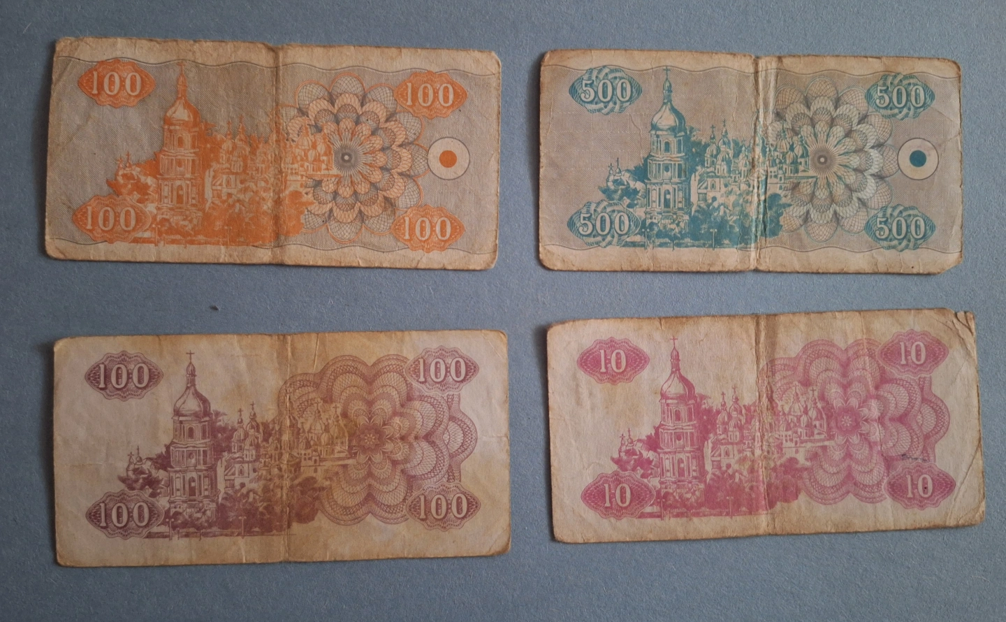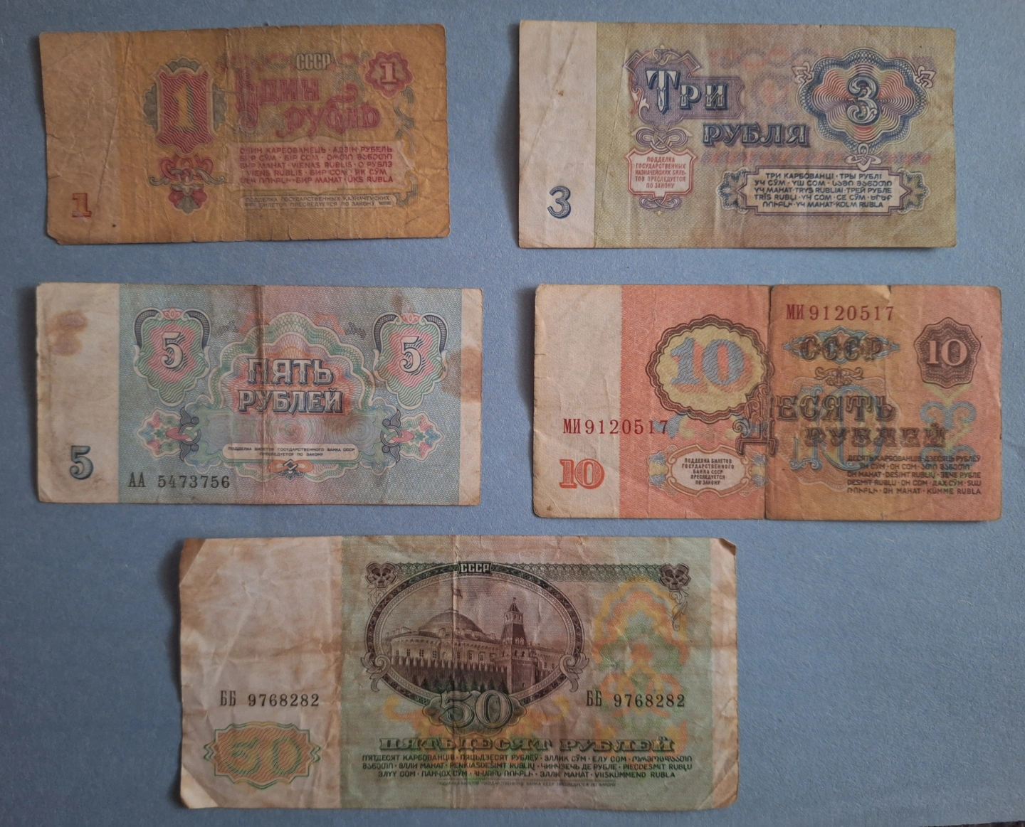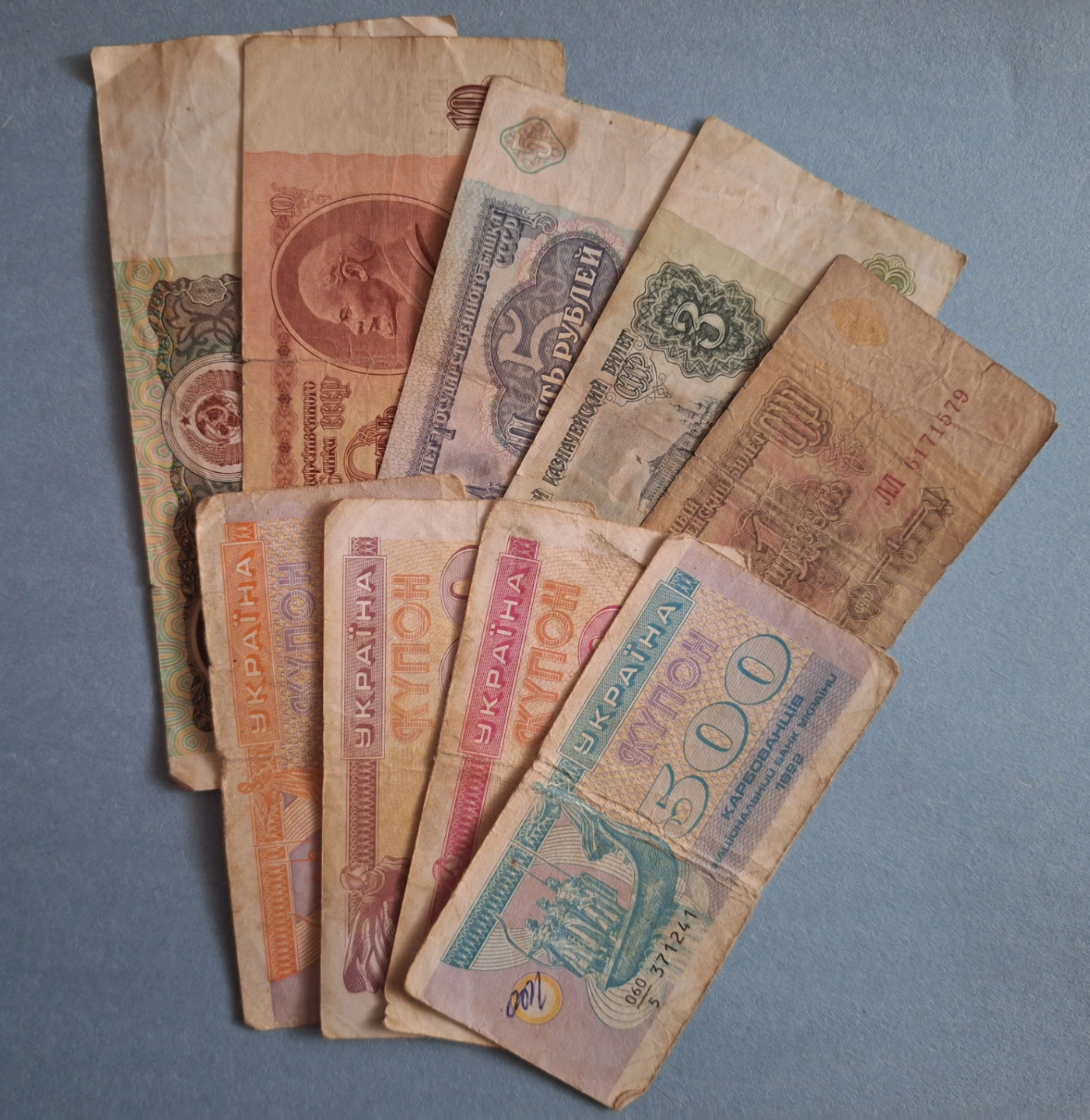 Rare collection of vintage USSR Soviet 1960s and early independence 1990s Ukrainian banknotes. Various denominations and designs. Showcasing historical currency. Good for collectors or history enthusiasts.