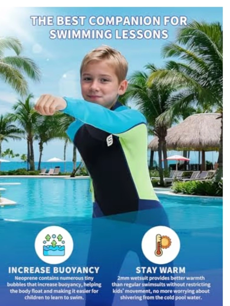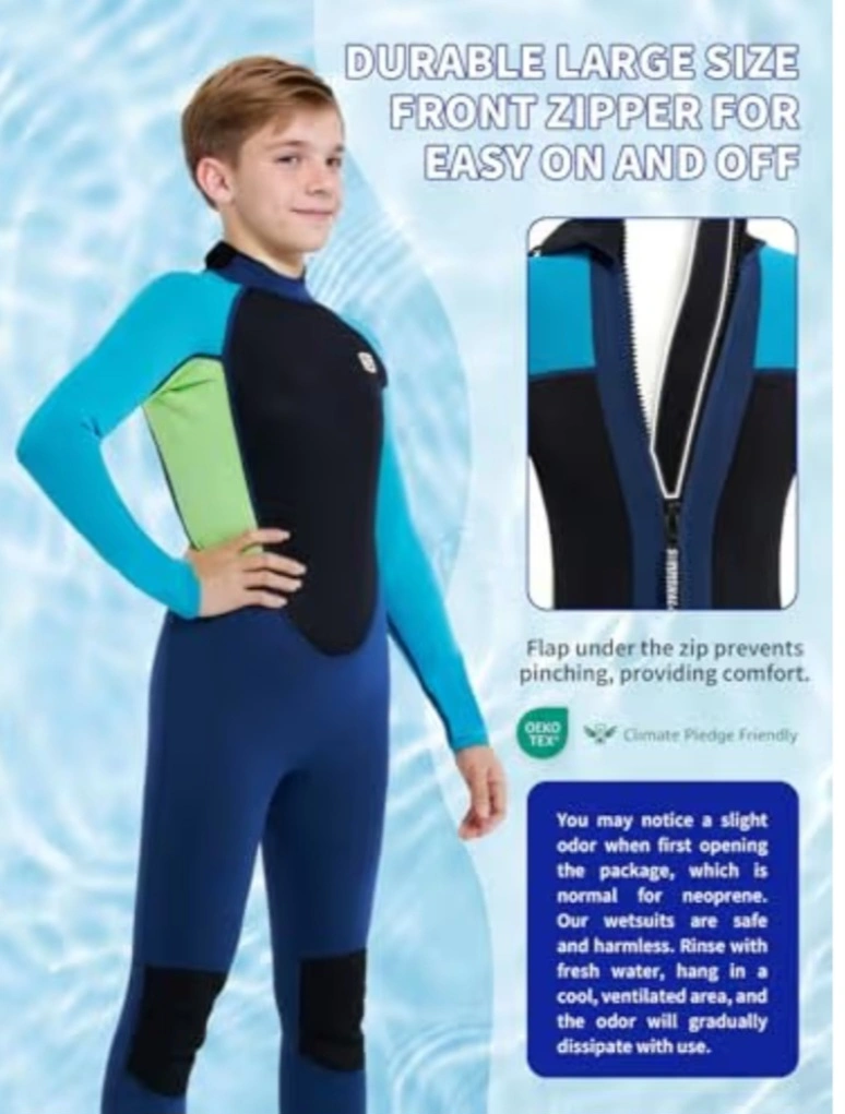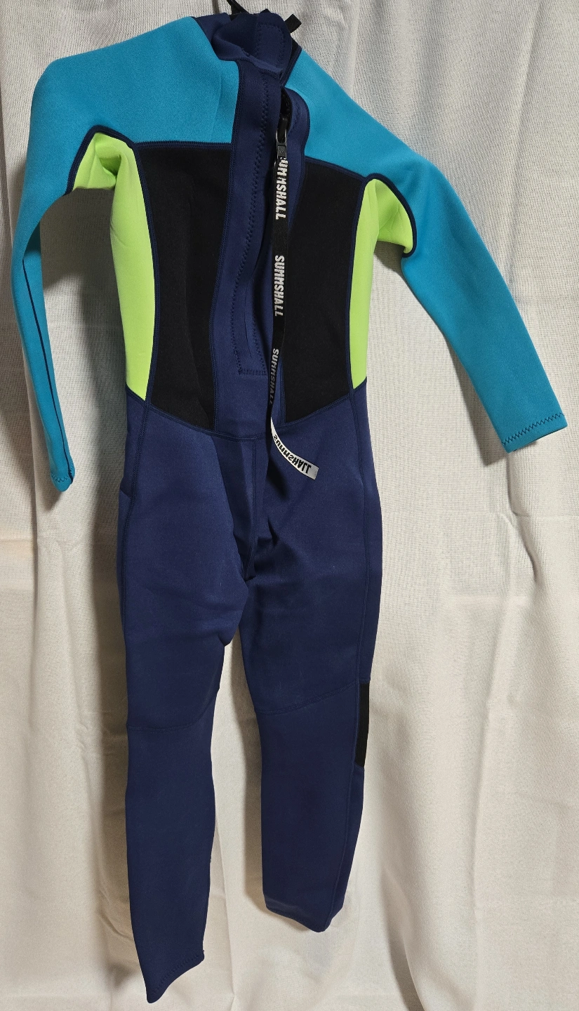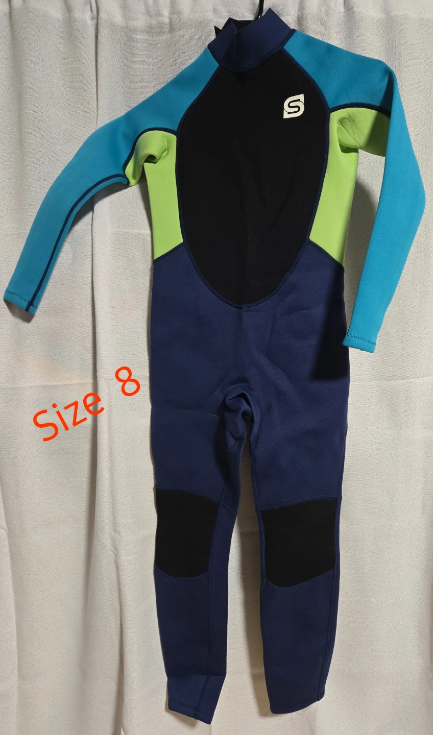 Child's full-length wetsuit. Colour-blocked design. Size 8. Suitable for swimming lessons.