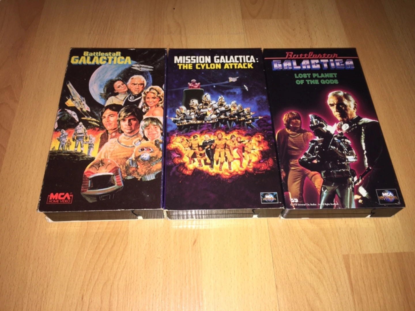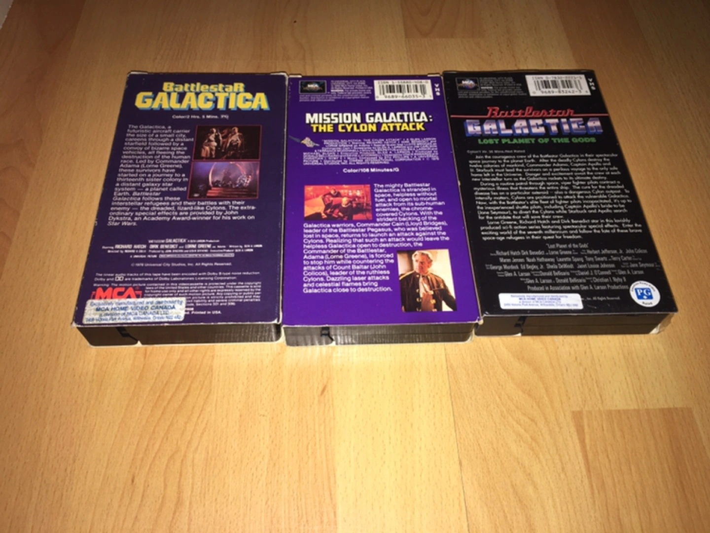 Three VHS tapes: Battlestar Galactica, Mission Galactica: The Cylon Attack, and Battlestar Galactica: Lost Planet of the Gods. MCA Home Video releases. Selling all 3 VHS tapes for $20.