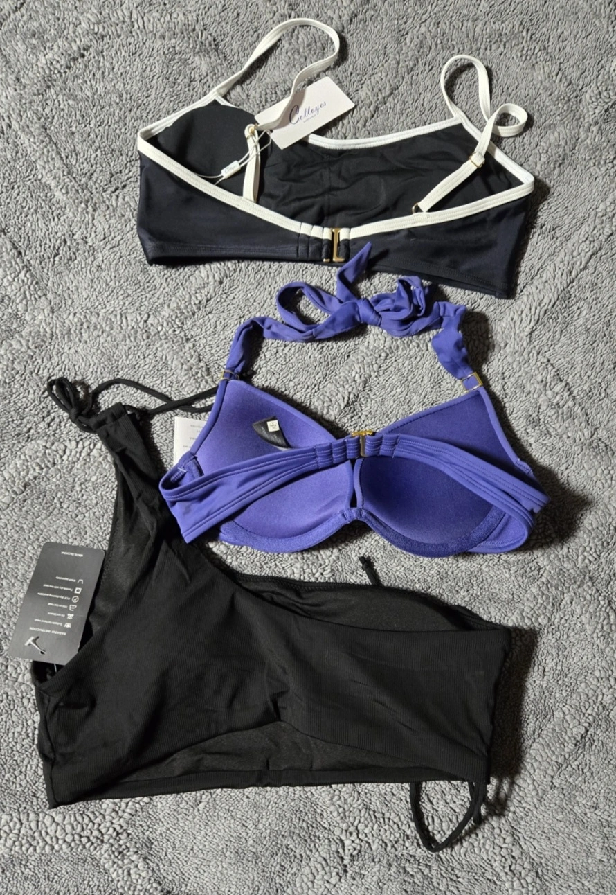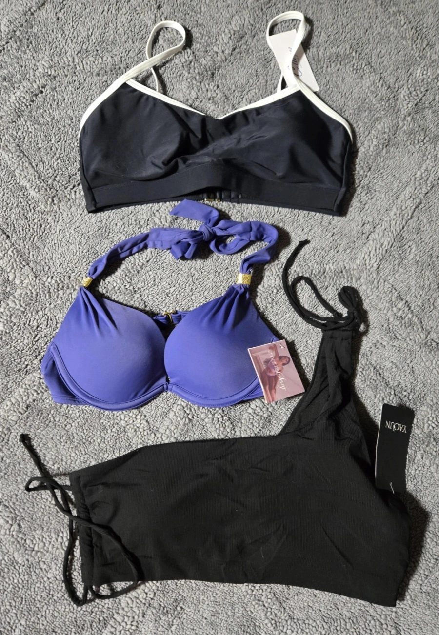 Three women's bikinis. One black bikini top and bottom. One purple halter bikini top and black bottom. All appear new with tags.One for $5, all three for $10
