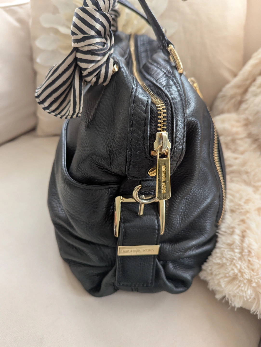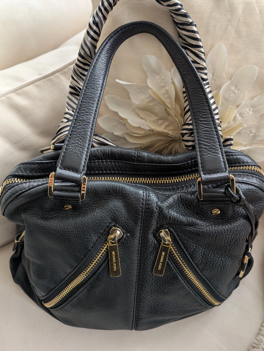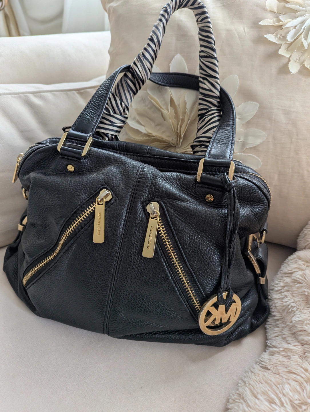 MK Black leather handbag. Goldtone hardware. Multiple zipper compartments. Top handles. Additional crossbody strap is included. excellent condition, velvet soft leather and a very practical size. The black and white striped scarf accent is not included.